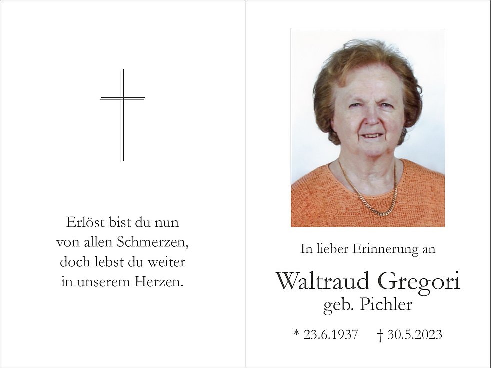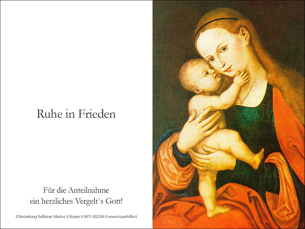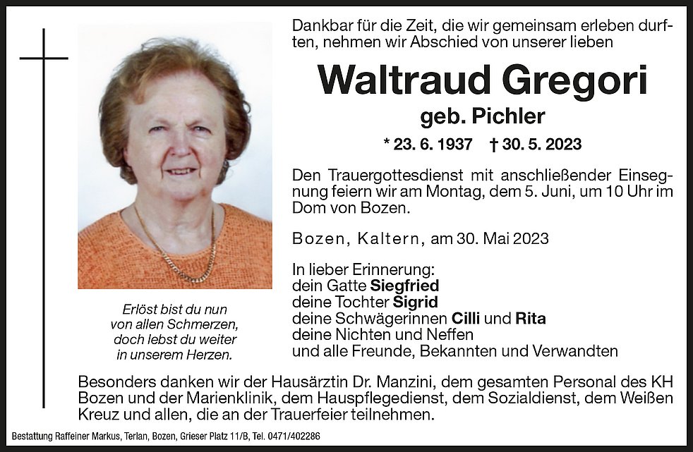Besonders danken wir der Hausärztin Dr. Manzini, dem gesamten Personal des KH-Bozens und der Marienklinik, dem Hauspflegedienst, dem Sozialdienst, dem Weissen Kreuz und allen, die an der Trauerfeier teilnehmen.