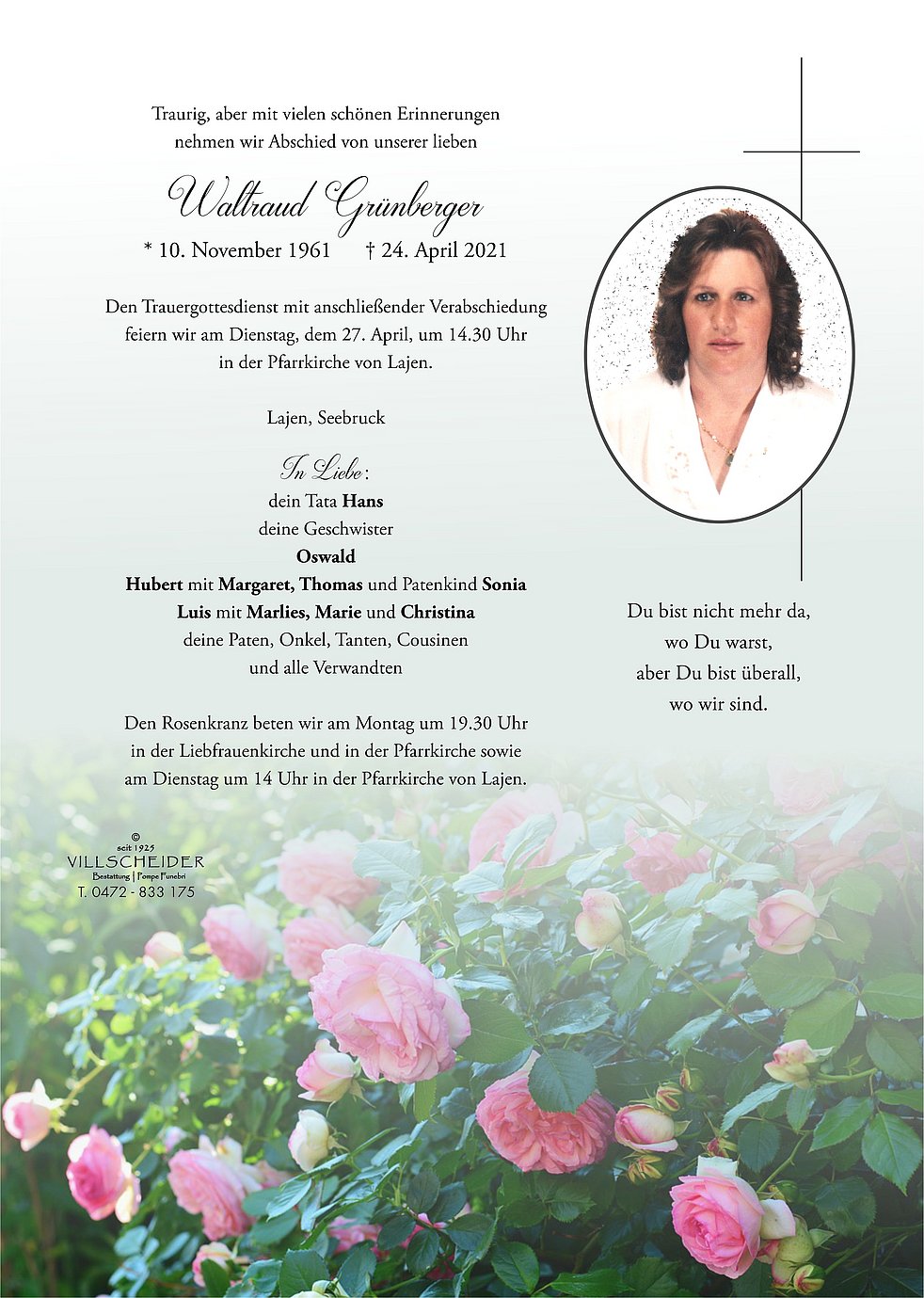 Trauerfeier: 27.04. - 14:30 Uhr Lajen