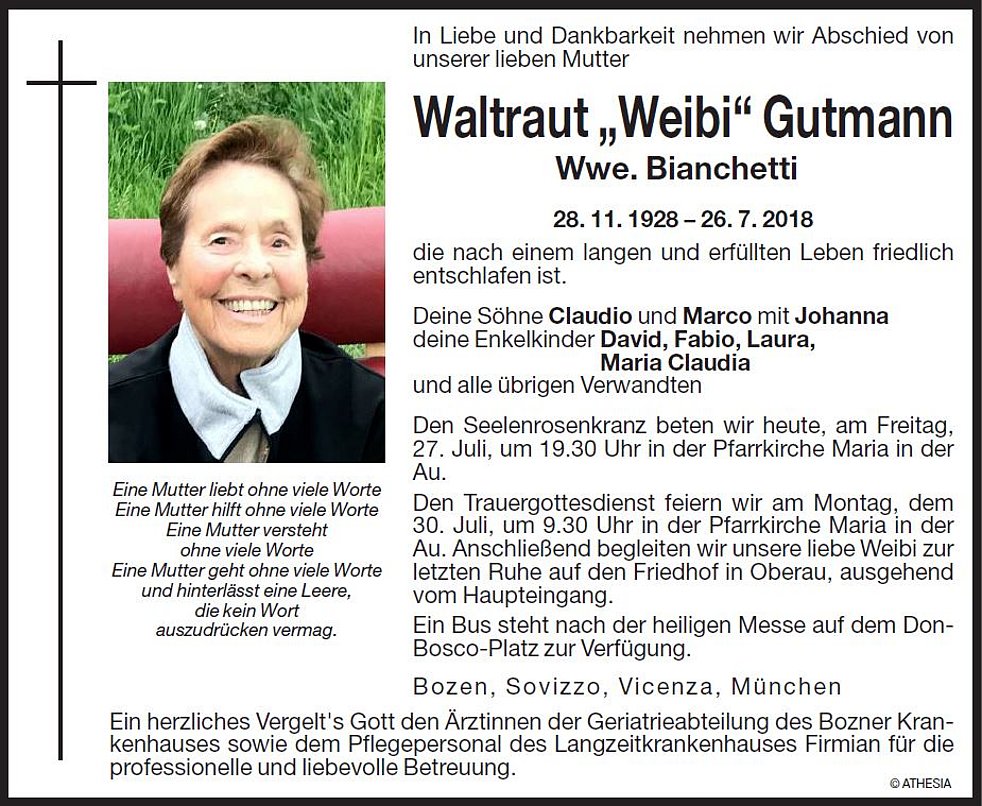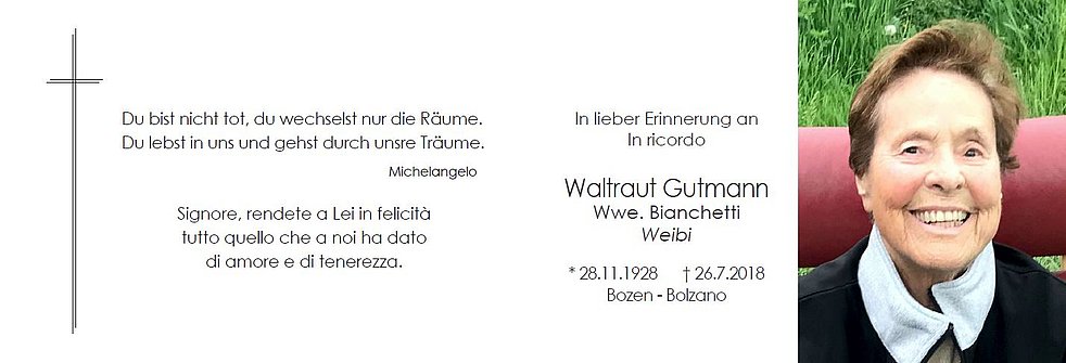 Den Trauergottesdienst feiern wir am Montag, dem 30. Juli, um 9.30 Uhr in der Pfarrkirche Maria in der Au. Anschließend um 11 Uhr begleiten wir unsere liebe Verstorbene zur letzten Ruhe auf den städtischen Friedhof von Bozen-Oberau, ausgehend vom Haupteingang.