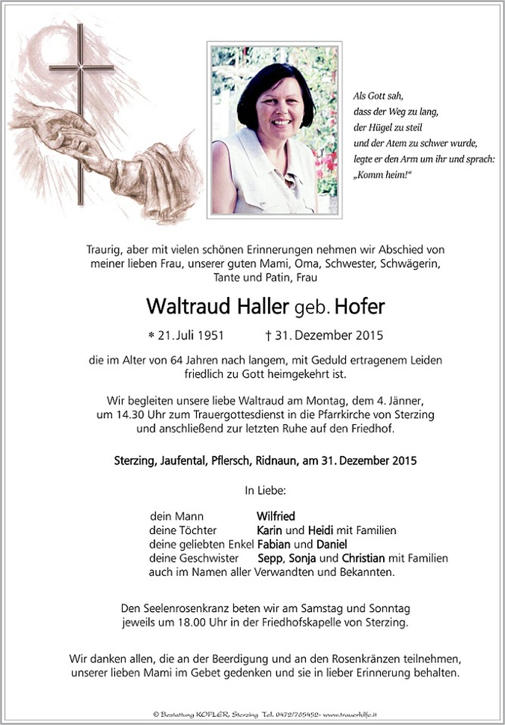 Wir begleiten unsere liebe Waltraud am Montag, dem 4. Jänner,