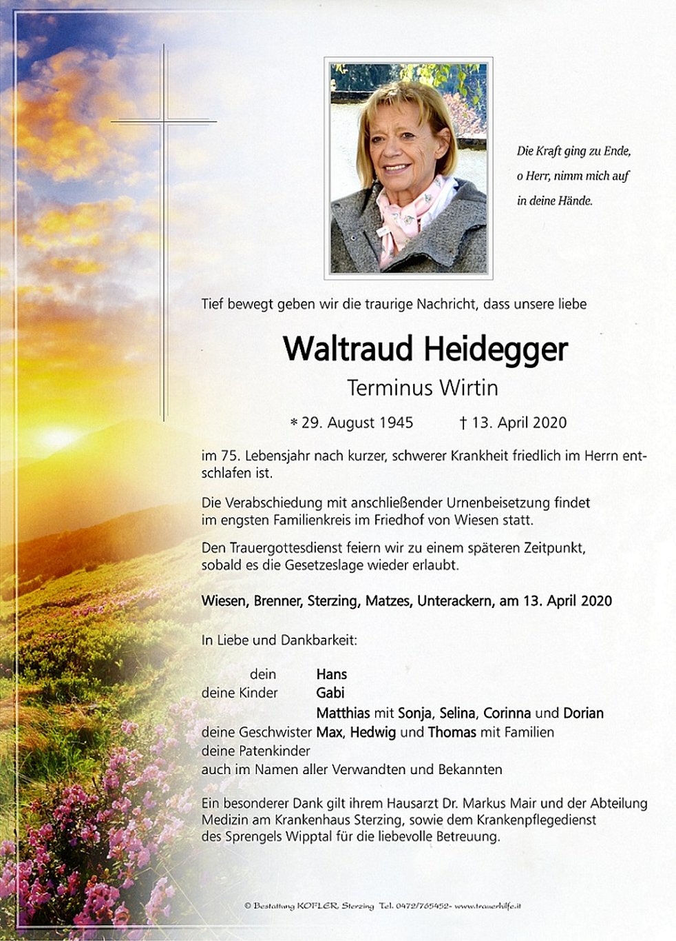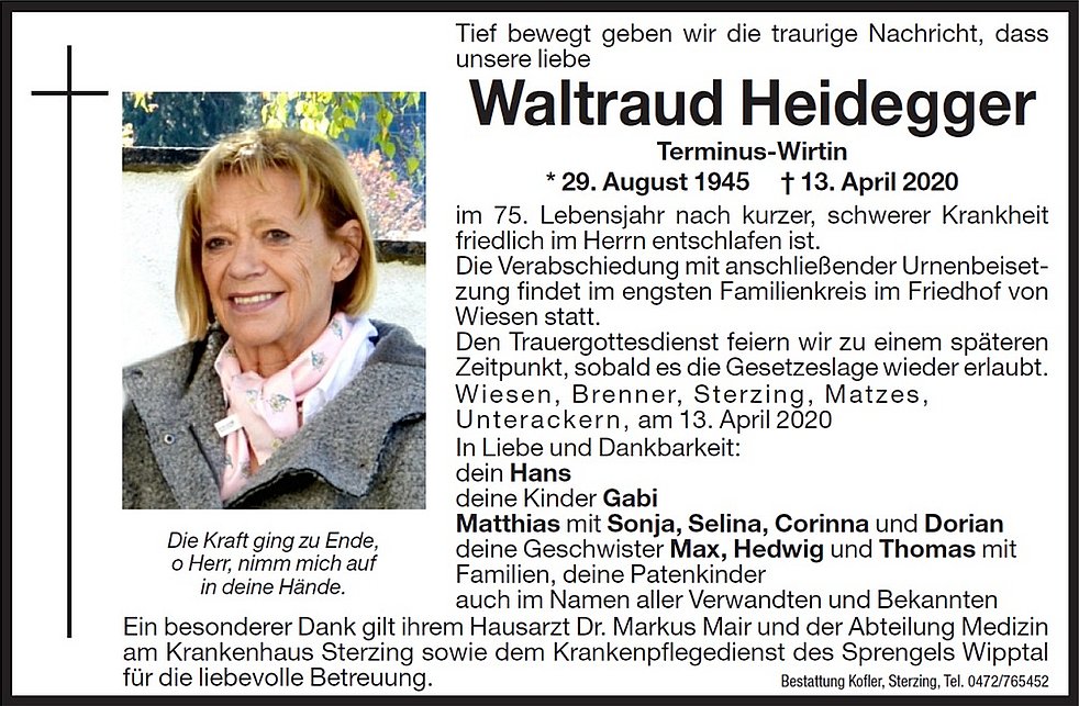 Ein besonderer Dank gilt ihrem Hausarzt Dr. Markus Mair und der Abteilung Medizin am Krankenhaus Sterzing, sowie dem Krankenpflegedienst des Sprengels Wipptal für die liebevolle Betreuung.
