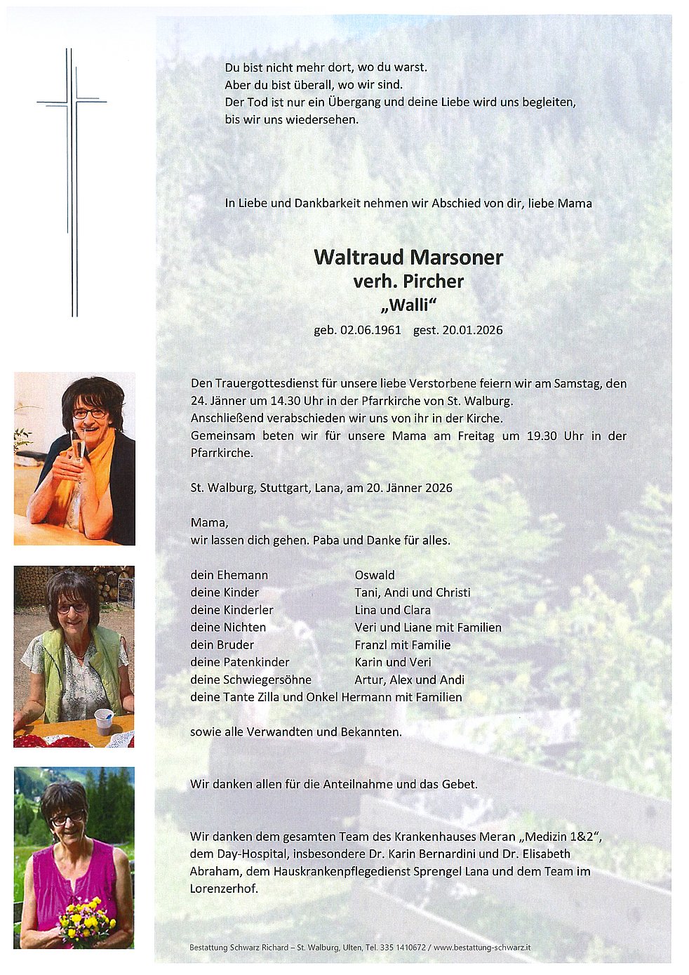 Mir sprechen allen inser tief empfundenes Beileid aus. Pfiati Walli wer deine Herzlichkeit u bsunders dein Lochn nia vergessen.