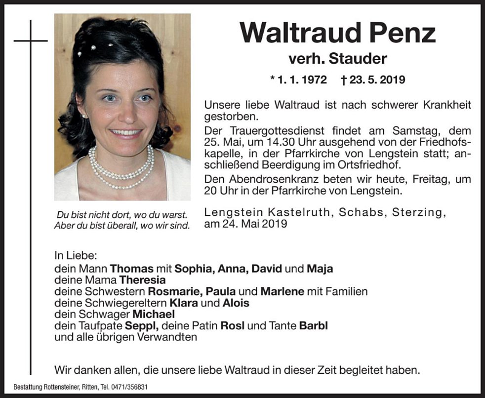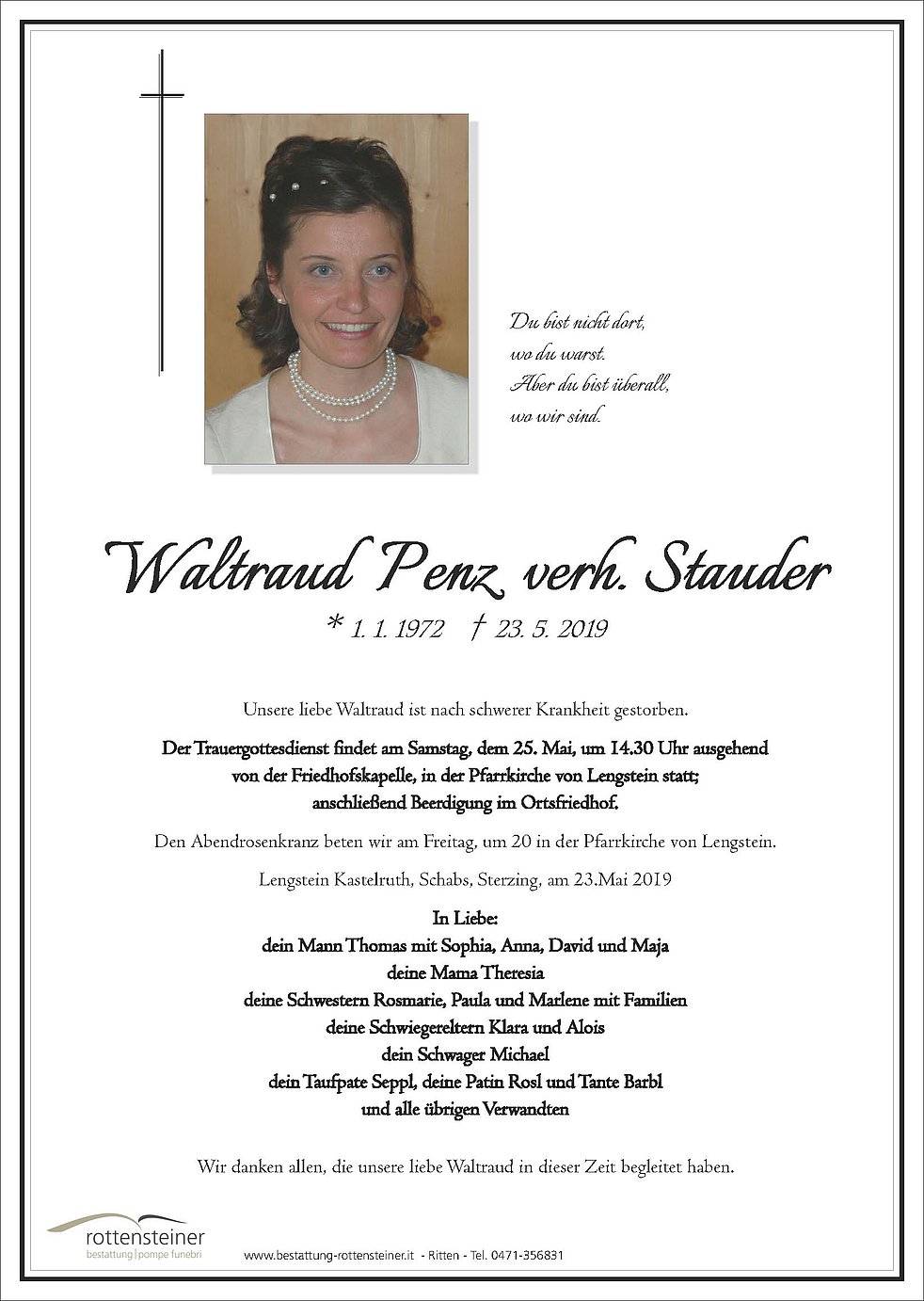 Waltraud, Danke für all die schönen Momente. Unsere gemeinsamen Erlebnisse bleiben für immer unvergessen. Du hast mir mein Brautkleid genäht, obwohl du damals so viel um die Ohren hattest. Du hast damals gemeint, dass du mir das versprochen hast. Für dich war vieles so selbstverständlich, du hast nie geklagt. Ich vermisse dich. Ich werde dich für immer in meinem Herzen tragen. Pfiati "TraTra". Gute Reise!