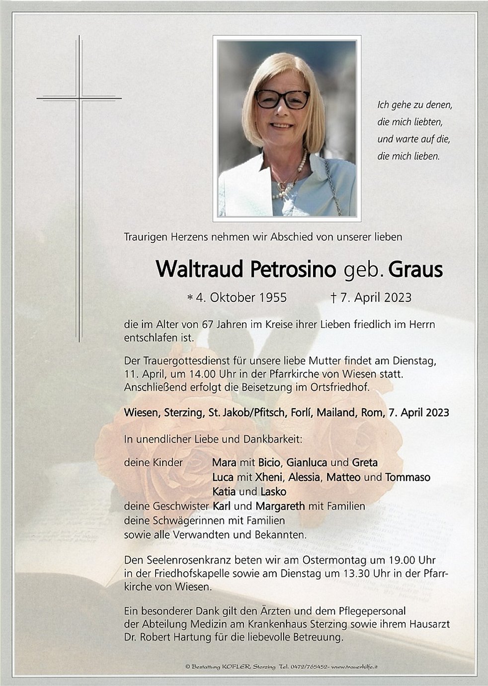 Ein besonderer Dank gilt den Ärzten und dem Pflegepersonal der Abteilung Medizin am Krankenhaus Sterzing sowie ihrem Hausarzt Dr. Robert Hartung für die liebevolle Betreuung.