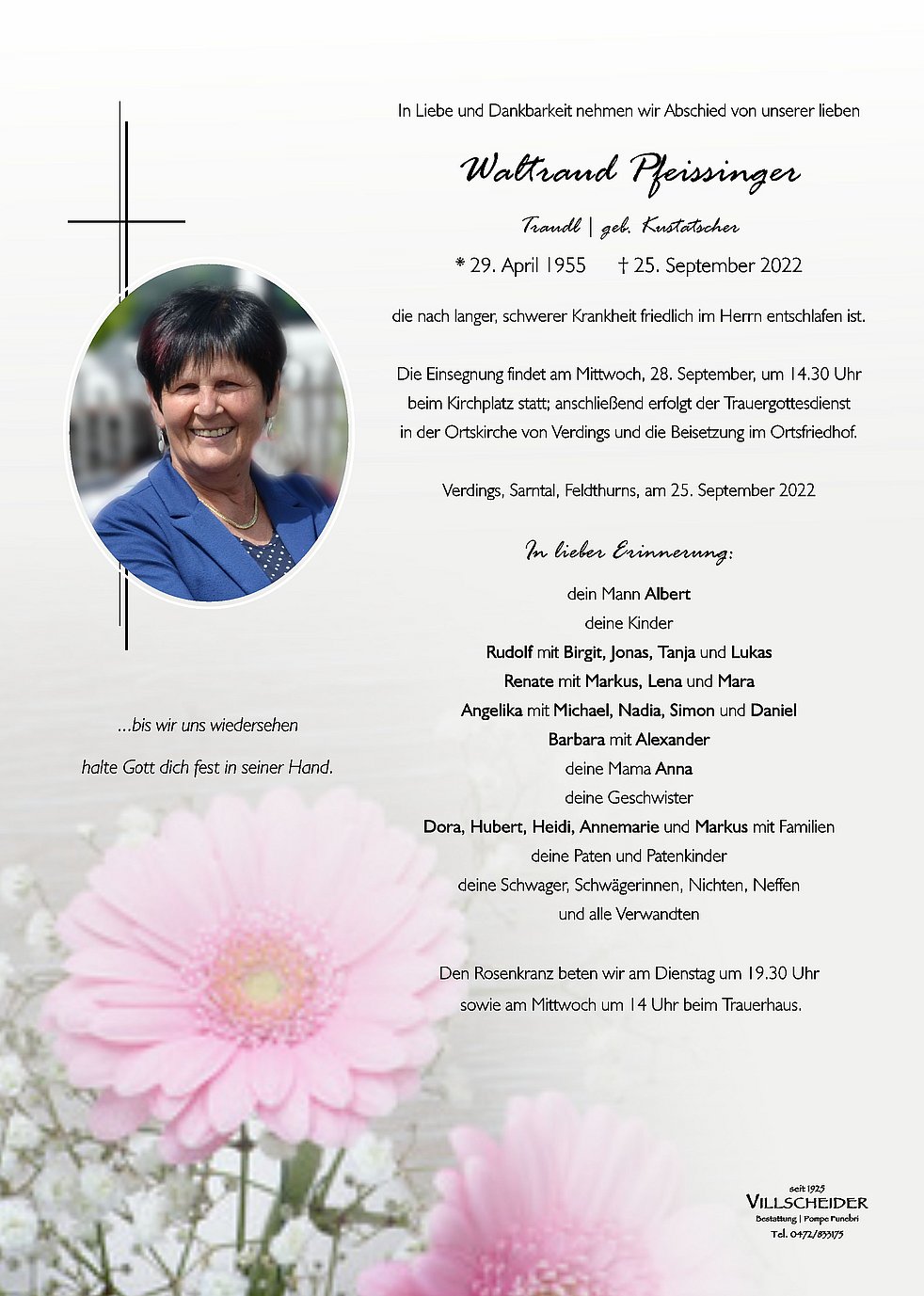 Liebe Traudl, du warst ein so wundervoller Mensch, herzensgut und offen, so voller Freude und Sympathie, du warst das Herz der Dorfgemeinschaft von Verdings. So viel hast du für deine Familie und fürs Dorf getan, mit einer Selbstverständlichkeit, und an manchen Tagen bist du kaum zum Schlafen gekommen. Die schwere Krankheit hast du dir nicht verdient... Nun kannst du ruhen in Frieden, wir behalten dich in unseren Herzen. Danke, Traudl. Mein Beileid allen Angehörigen.