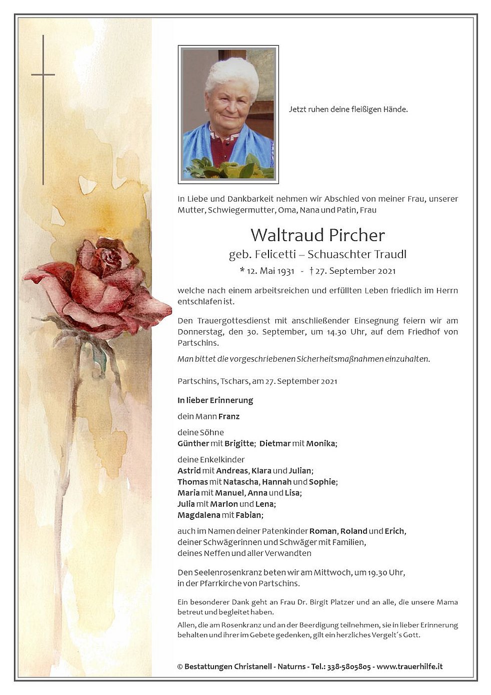 Den Trauergottesdienst mit anschließender Einsegnung feiern wir am Donnerstag, den 30. September, um 14.30 Uhr, auf dem Friedhof von Partschins.