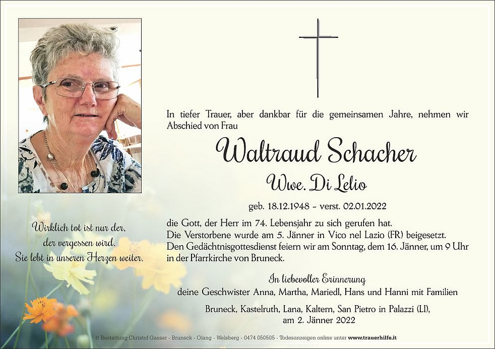 Den Gedächtnisgottesdienst feiern wir am Sonntag, dem 16. Jänner, um 9 Uhr in der Pfarrkirche von Bruneck.