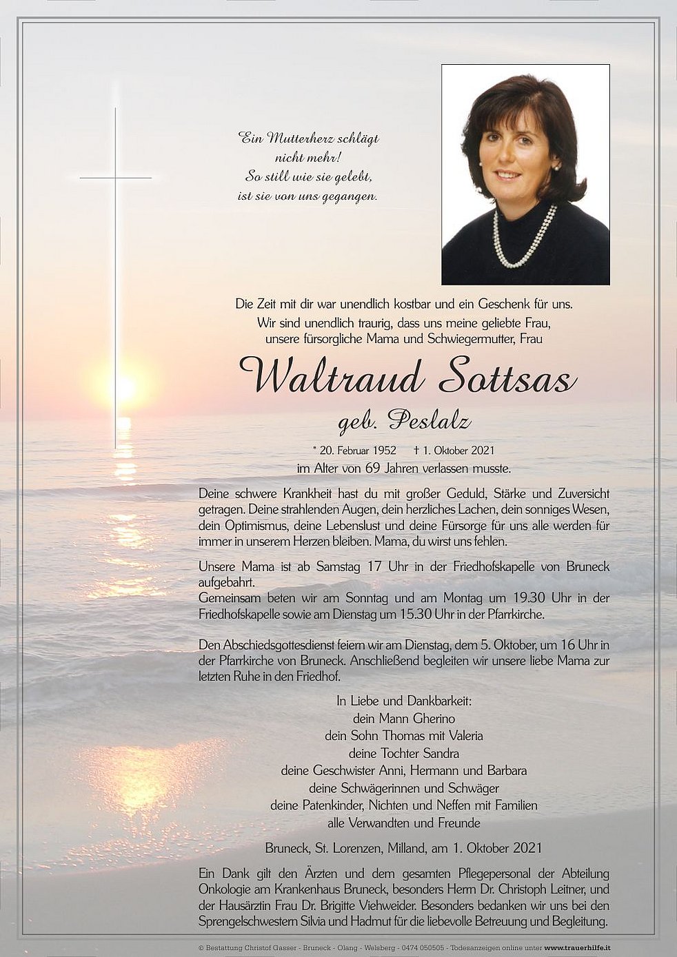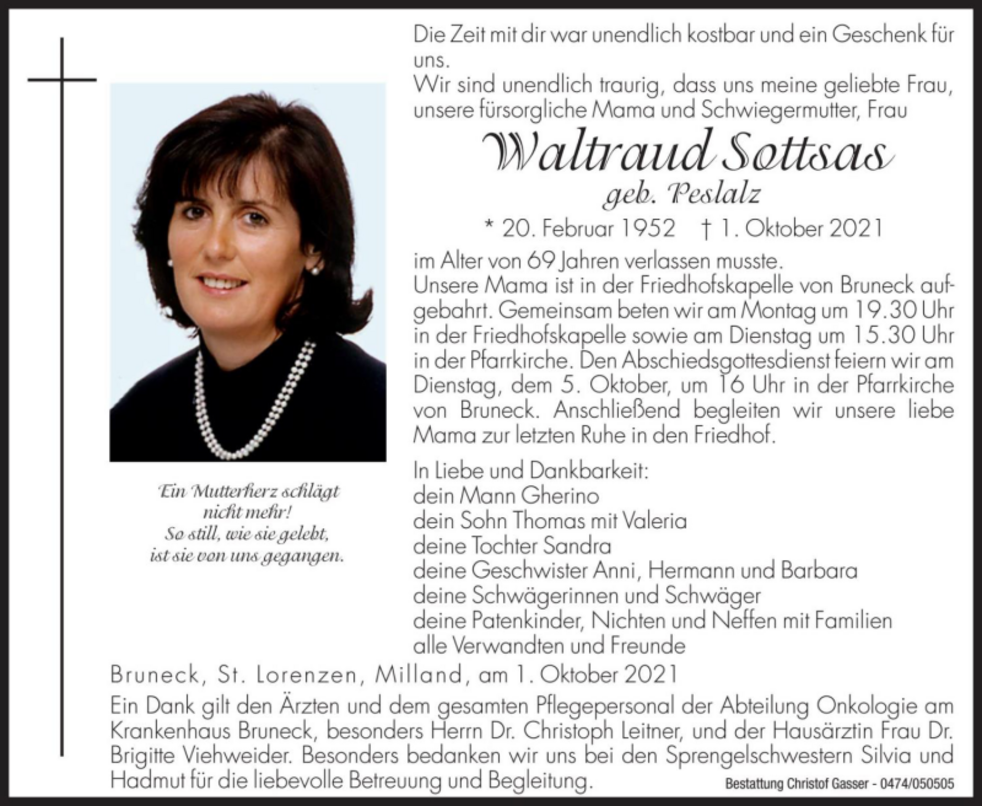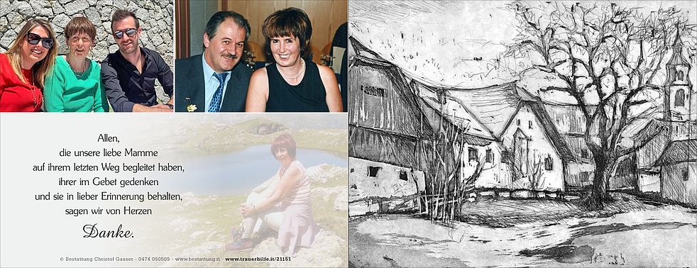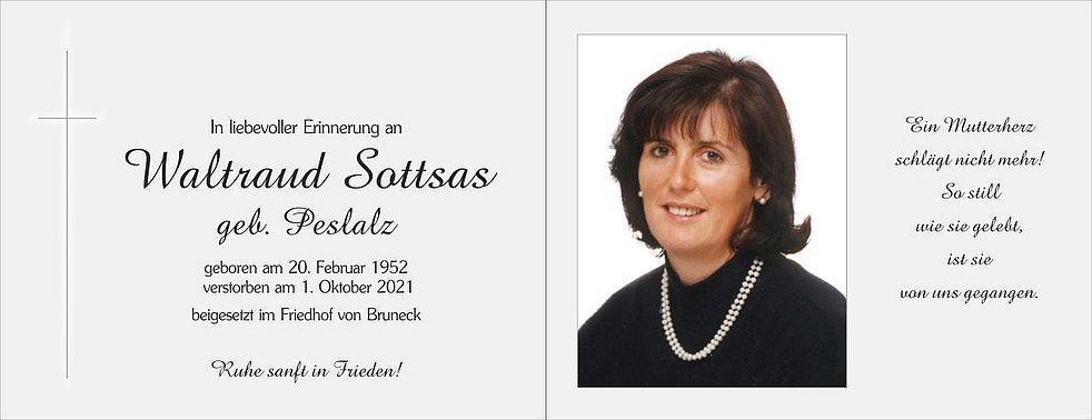 Den Abschiedsgottesdienst feiern wir am Dienstag, dem 5. Oktober, um 16 Uhr in der Pfarrkirche von Bruneck. Anschließend begleiten wir unsere liebe Mama zur letzten Ruhe in den Friedhof.