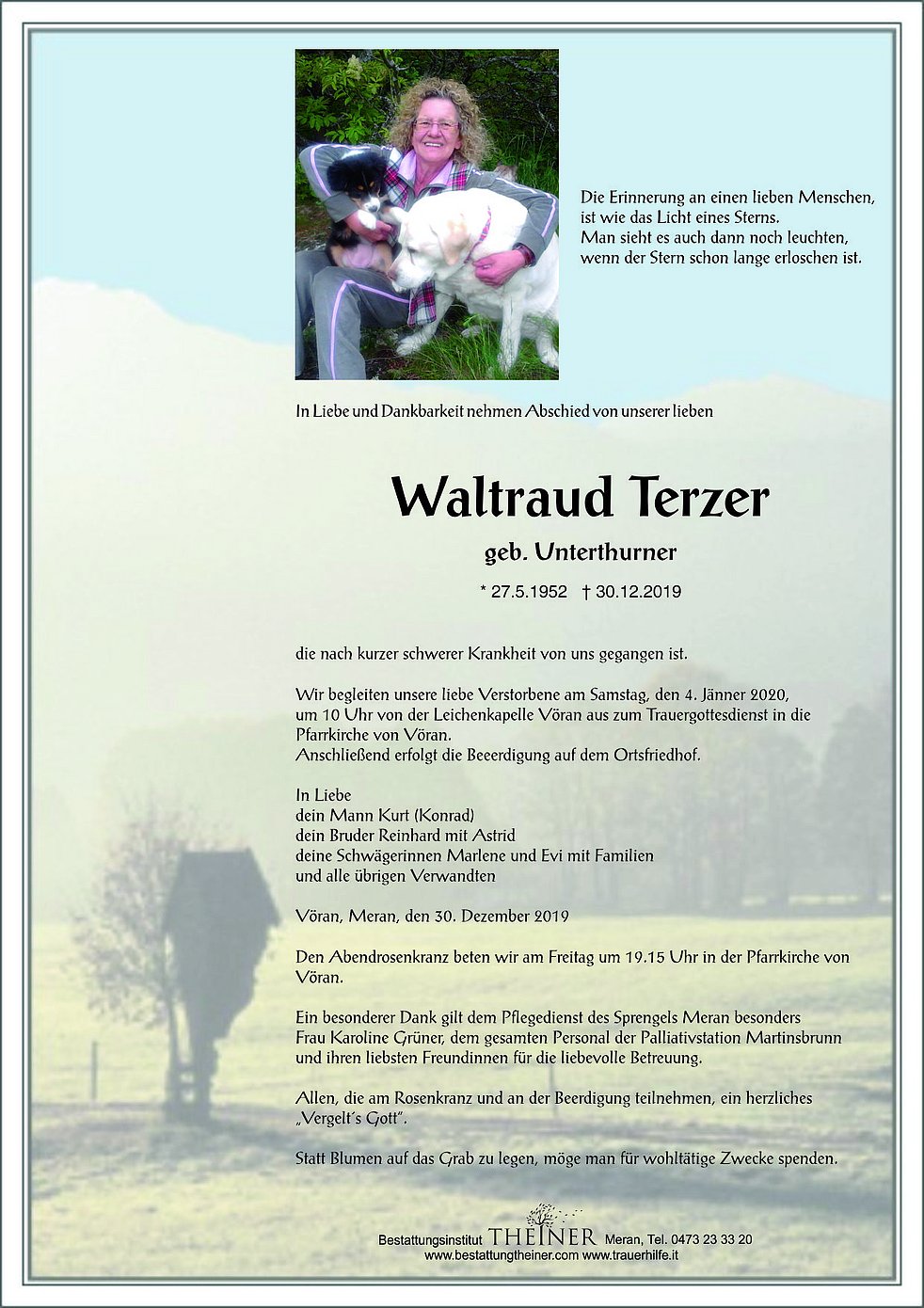 Ein besonderer Dank gilt dem Pflegedienst des Sprengels Meran besonders Frau Karoline Grüner, dem gesamten Personal der Palliativstation Martinsbrunn und ihren liebsten Freundinnen für die liebevolle Betreuung.