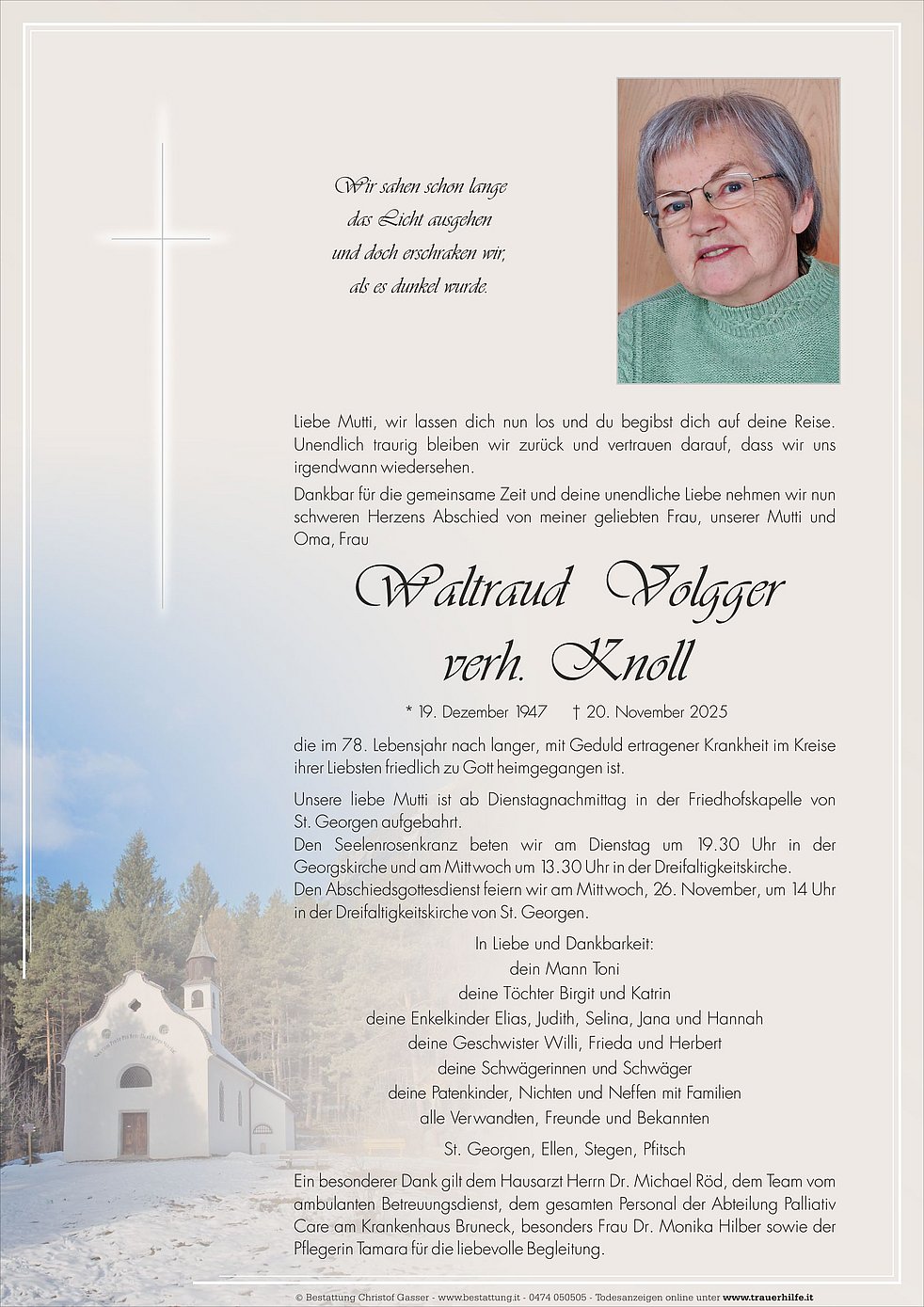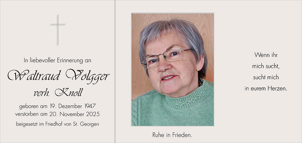 Unsere liebe Mutti ist ab Dienstagnachmittag in der Friedhofskapelle von St. Georgen aufgebahrt.