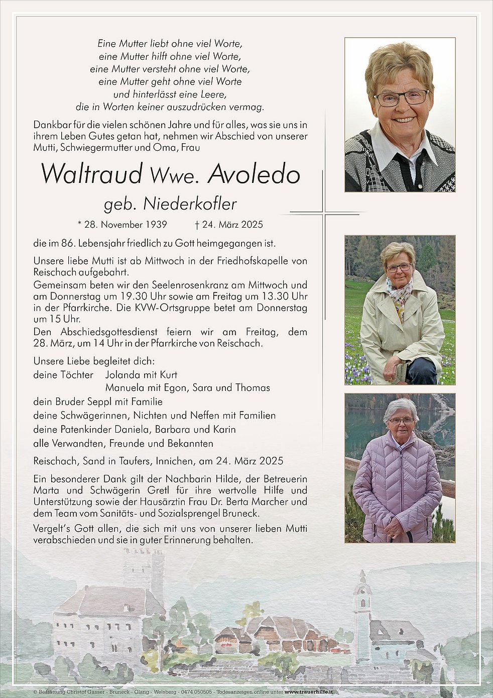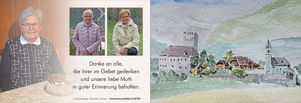 Ein besonderer Dank gilt der Nachbarin Hilde, der Betreuerin Marta und Schwägerin Gretl für ihre wertvolle Hilfe und Unterstützung sowie der Hausärztin Frau Dr. Berta Marcher und dem Team vom Sanitäts- und Sozialsprengel Bruneck.