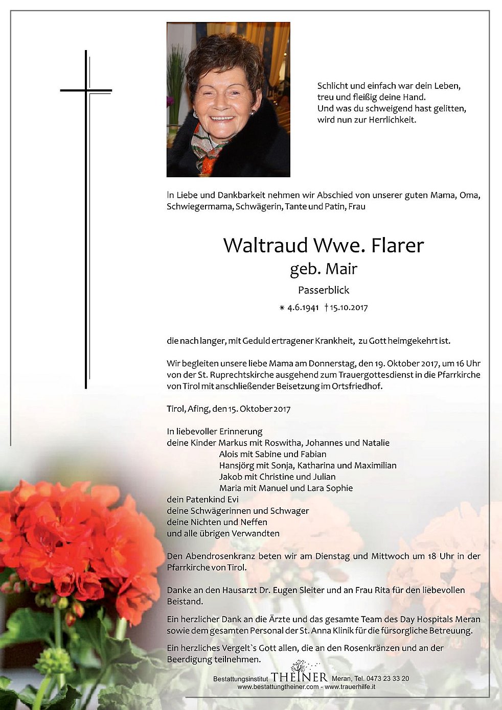 Wir begleiten unsere liebe Mama am Donnerstag, den 19. Oktober 2017, um 16 Uhr von der St. Ruprechtskirche ausgehend zum Trauergottesdienst in die Pfarrkirche von Tirol mit anschließender Beisetzung im Ortsfriedhof.