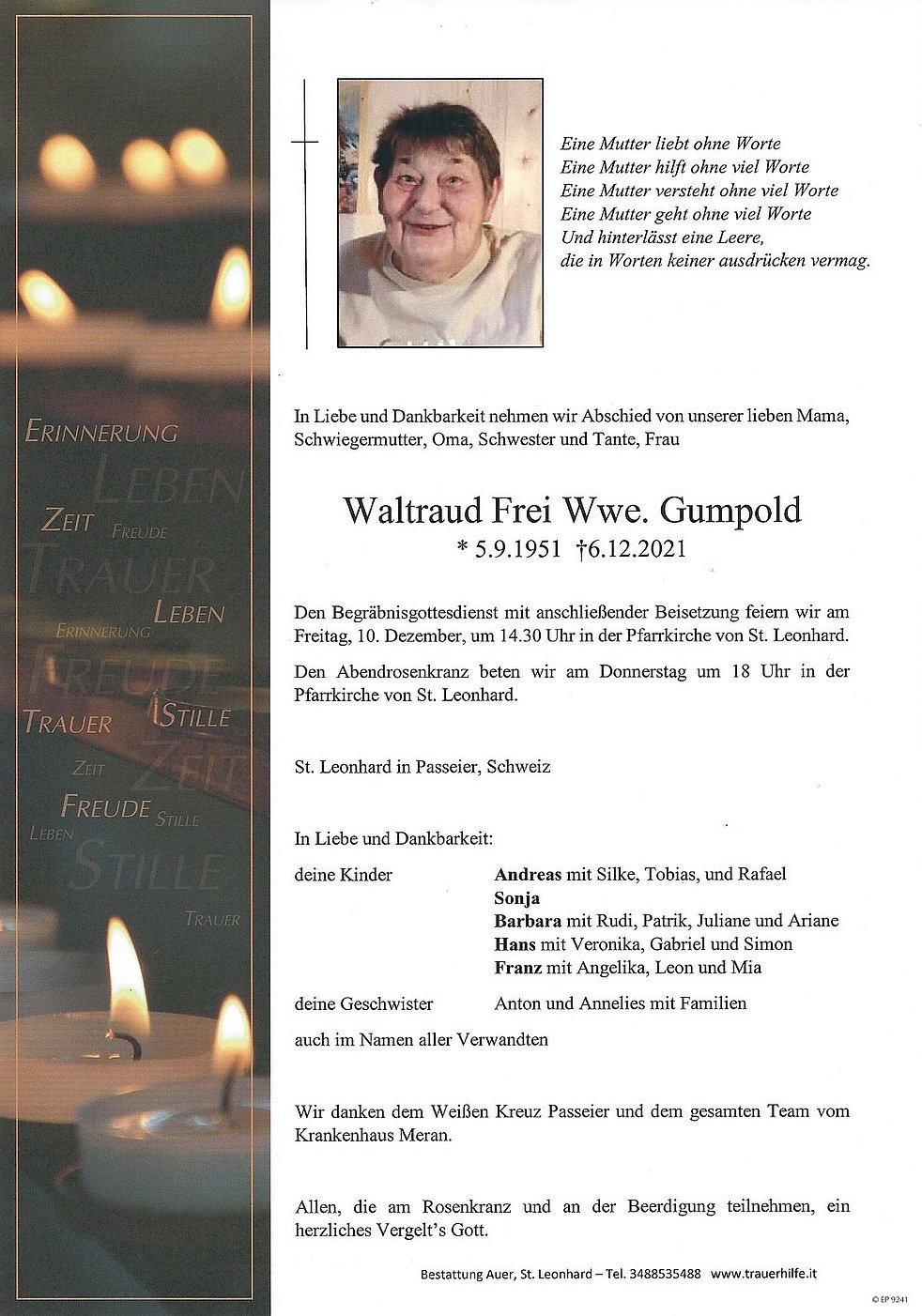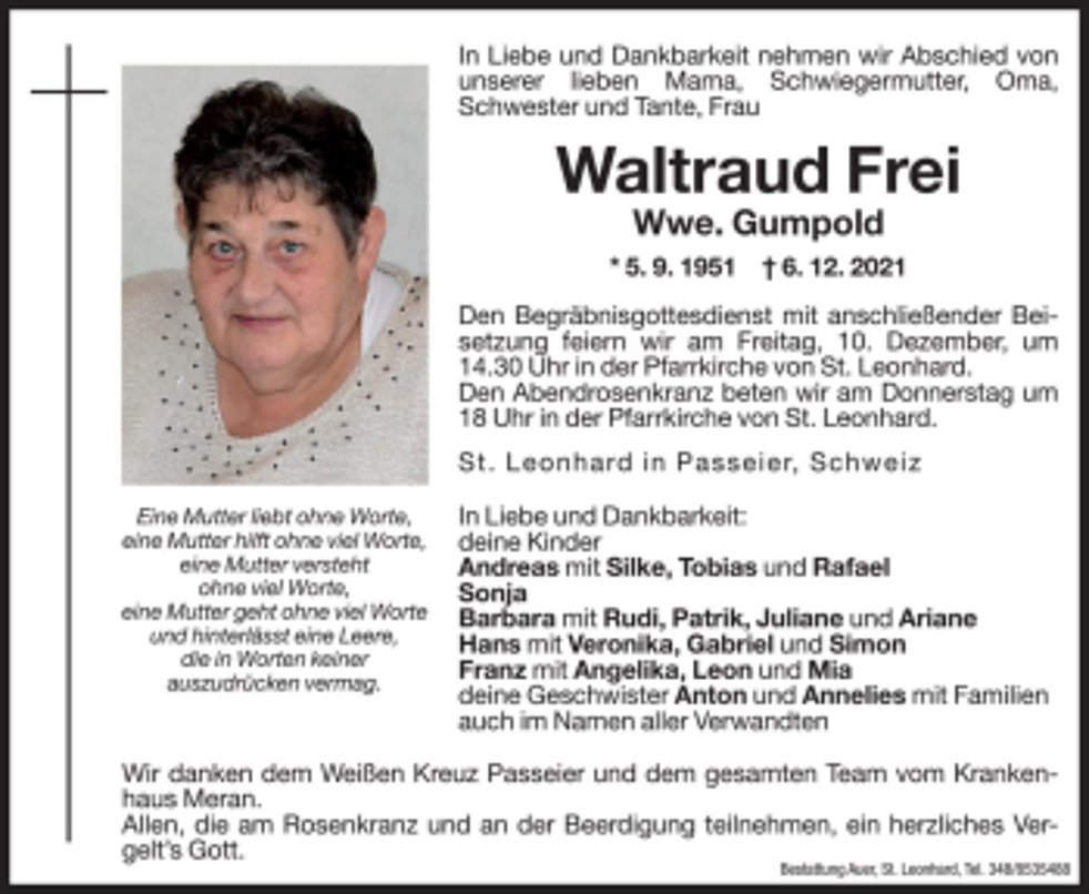 Den Begräbnisgottesdienst mit anschließender Beisetzung feiern wir am Freitag, 10. Dezember, um 14.30 Uhr in der Pfarrkirche von St. Leonhard.