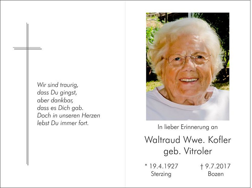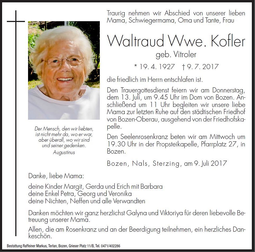 Den Trauergottesdienst feiern wir am Donnerstag, dem 13. Juli, um 9.45 Uhr im Dom von Bozen. Anschlieβend um 11 Uhr begleiten wir unsere liebe Mama zur letzten Ruhe auf den städtischen Friedhof von Bozen-Oberau, ausgehend von der Friedhofskapelle.