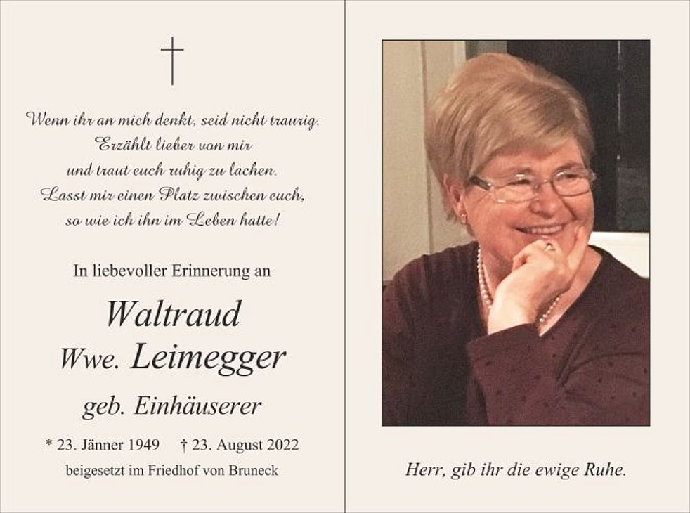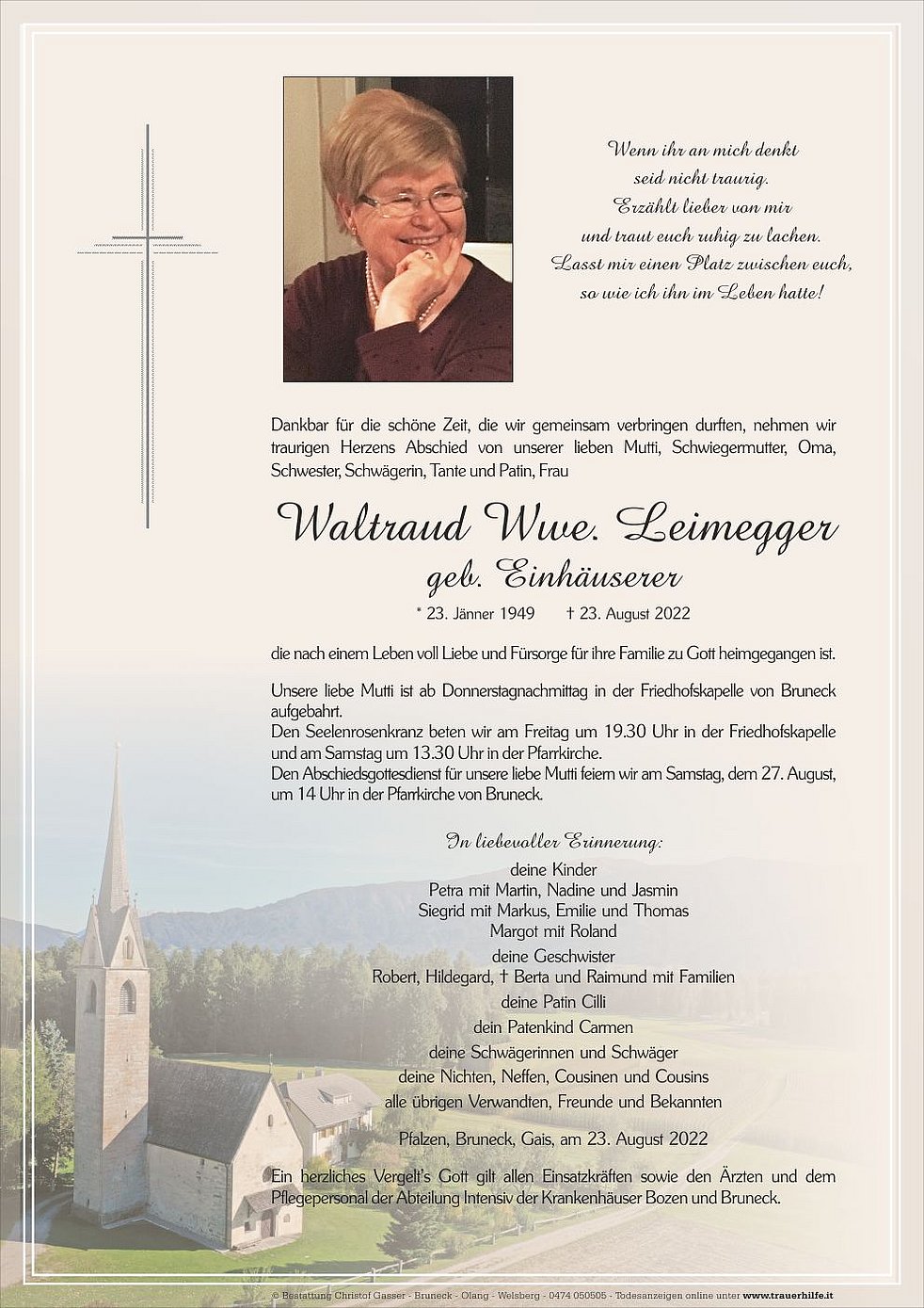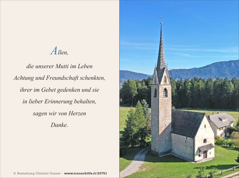Den Abschiedsgottesdienst für unsere liebe Mutti feiern wir am Samstag, dem 27. August, um 14 Uhr in der Pfarrkirche von Bruneck.