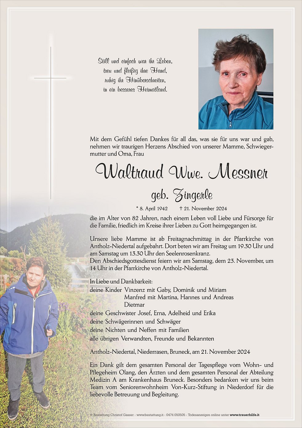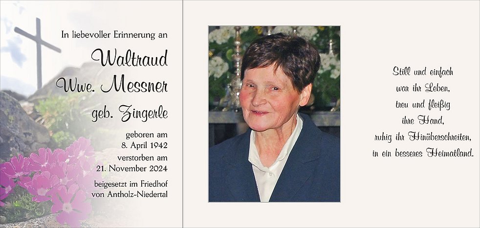 Ein Dank gilt dem gesamten Personal der Tagespflege vom Wohn- und Pflegeheim Olang, den Ärzten und dem gesamten Personal der Abteilung Medizin A am Krankenhaus Bruneck. Besonders bedanken wir uns beim Team vom Seniorenwohnheim Von-Kurz-Stiftung in Niederdorf für die liebevolle Betreuung und Begleitung.
