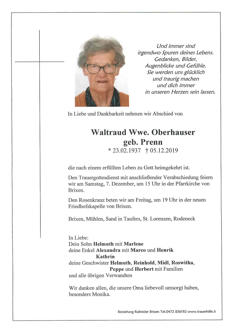 Den Trauergottesdienst mit anschließender Verabschiedung feiern wir am Samstag, 7. Dezember, um 15 Uhr in der Pfarrkirche von Brixen.