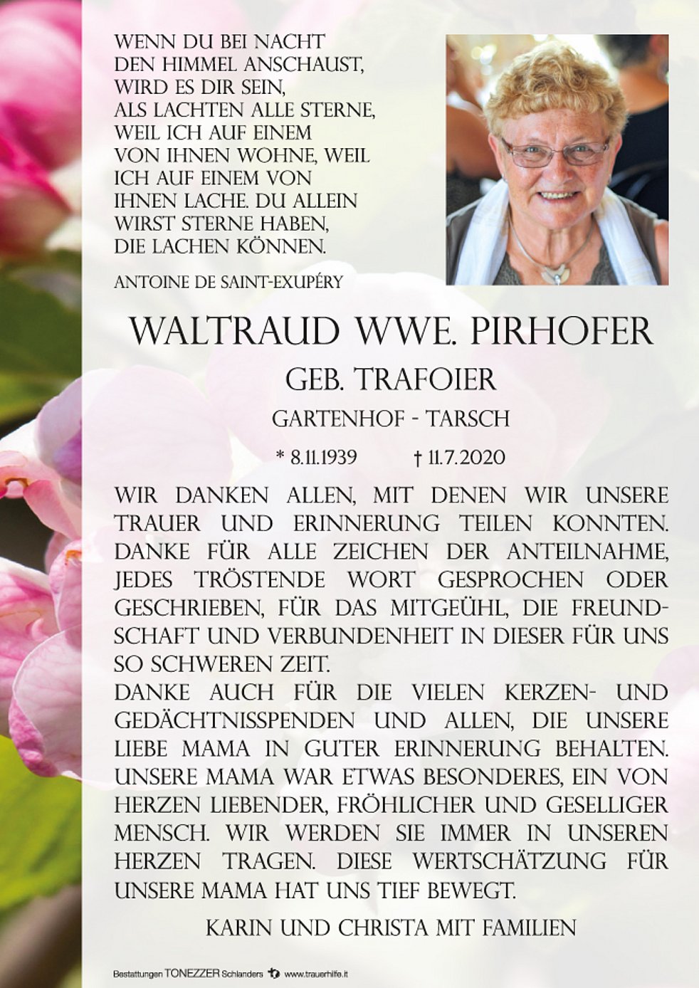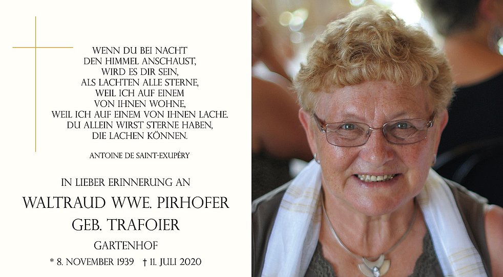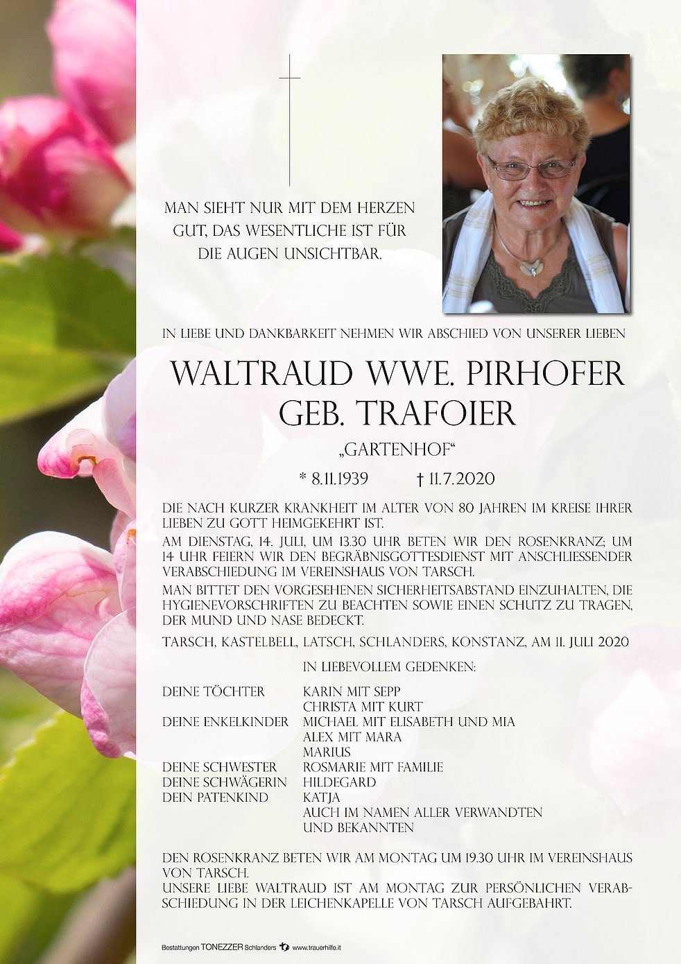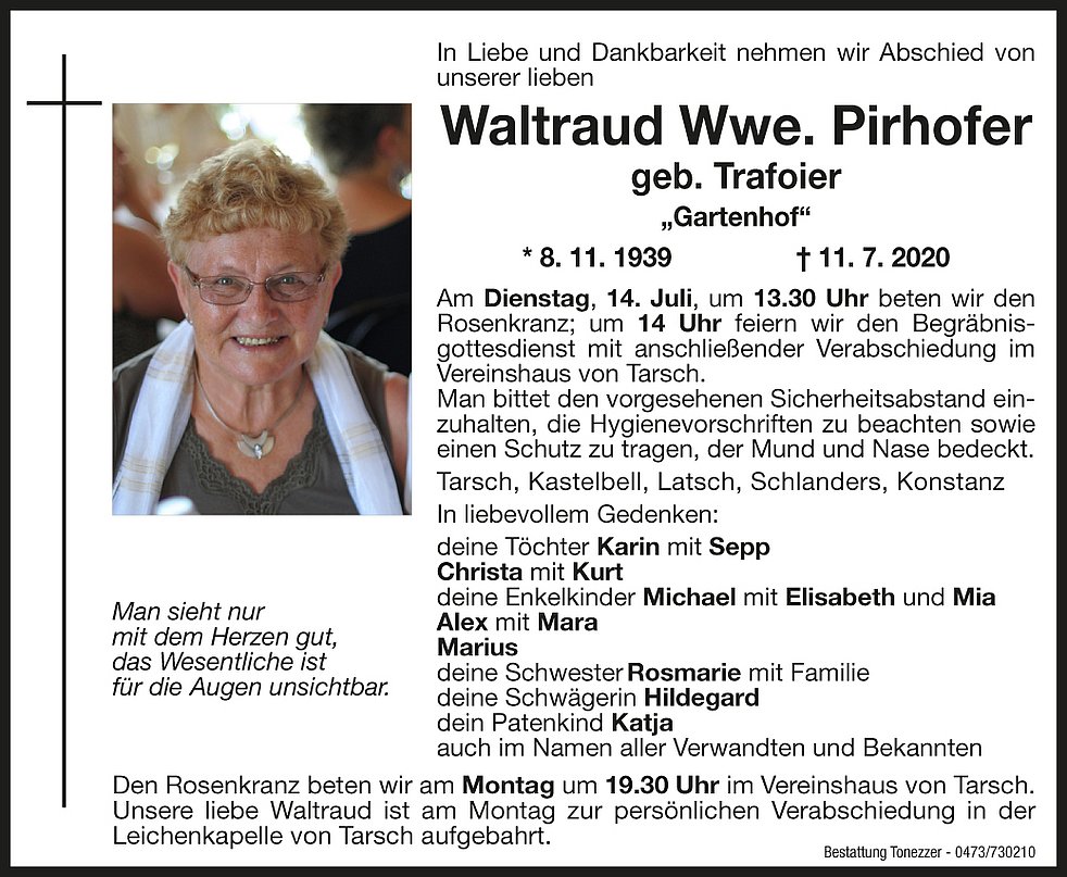 Am Dienstag, 14. Juli, um 13.30 Uhr beten wir den Rosenkranz; um 14 Uhr feiern wir den Begräbnisgottesdienst mit anschließender Verabschiedung im Vereinshaus von Tarsch.