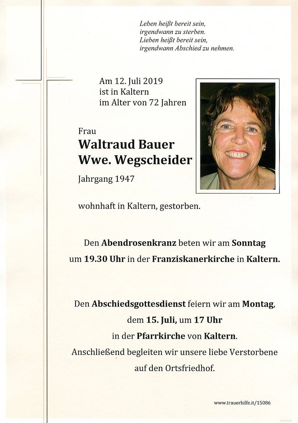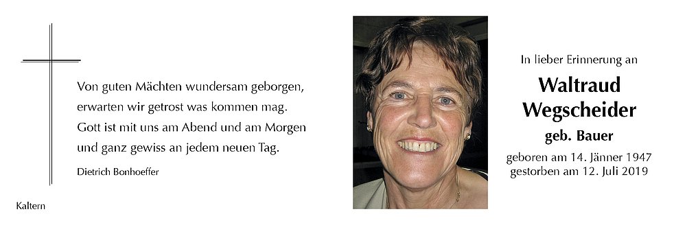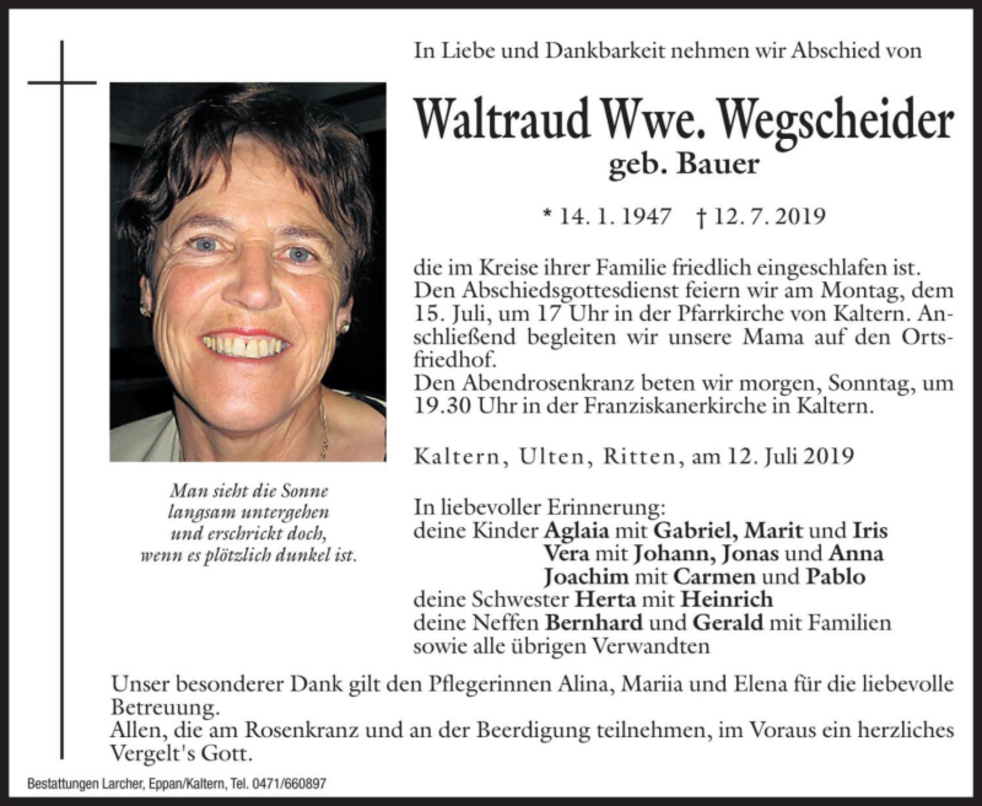 Den Abschiedsgottesdienst feiern wir am Montag, dem 15. Juli um 17 Uhr in der Pfarrkirche von Kaltern. Anschließend begleiten wir unsere Mama auf den Ortsfriedhof.