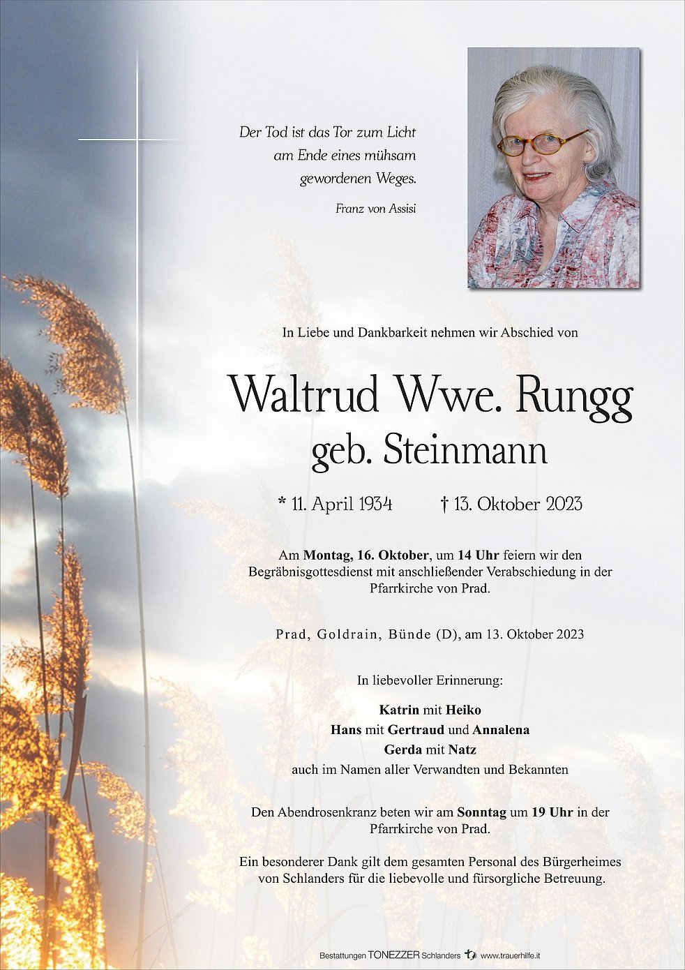 Begräbnisgottesdienst: 16.10. - 14:00 Uhr Pfarrkirche von Prad