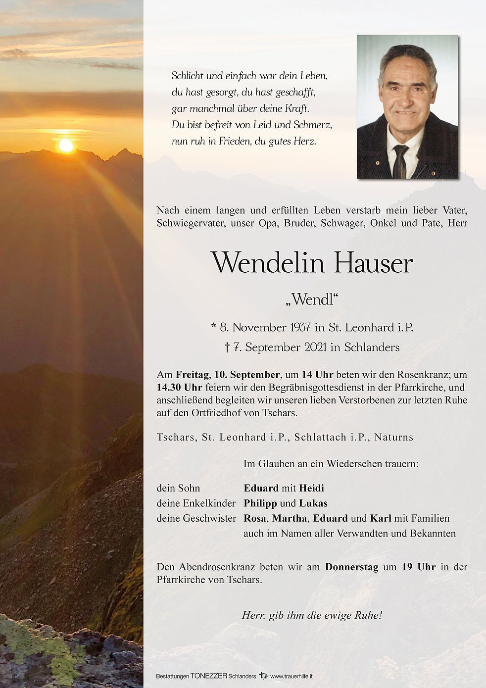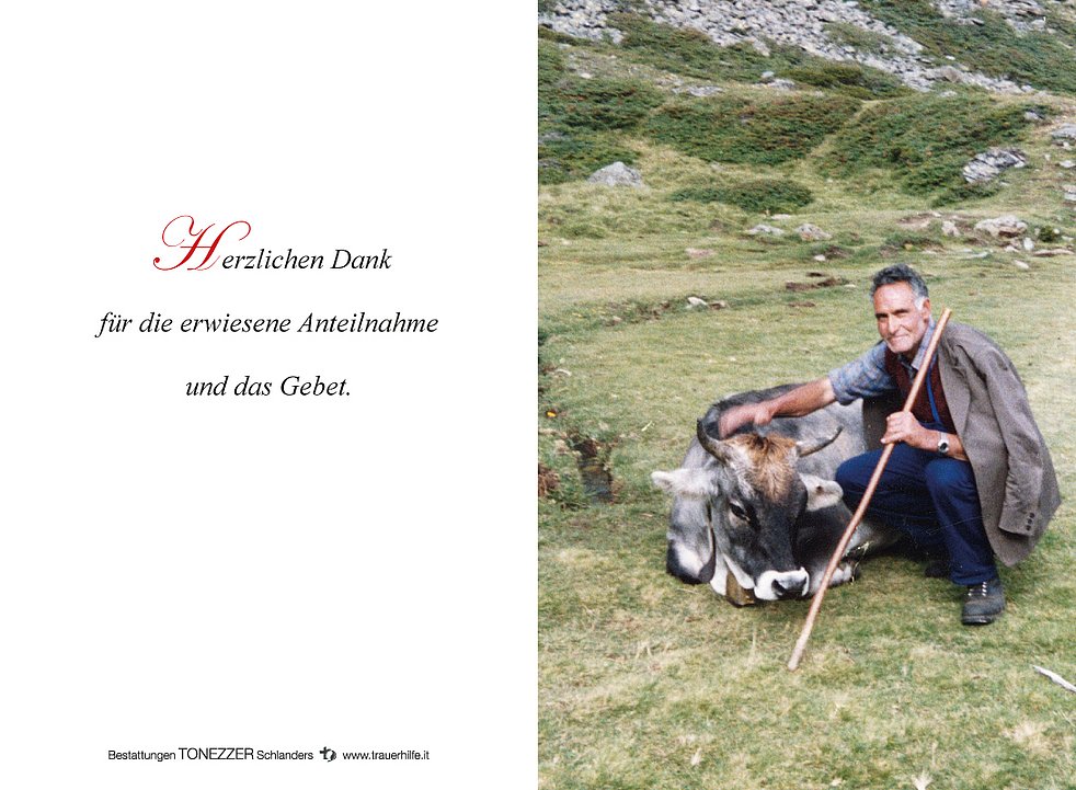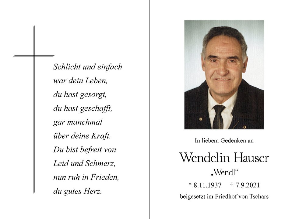 Am Freitag, 10. September, um 14 Uhr beten wir den Rosenkranz; um 14.30 Uhr feiern wir den Begräbnisgottesdienst in der Pfarrkirche, und anschließend begleiten wir unseren lieben Verstorbenen zur letzten Ruhe auf den Ortfriedhof von Tschars.