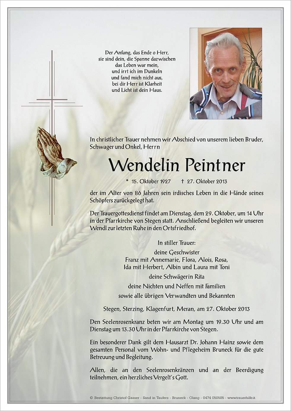 Der Trauergottesdienst findet am Dienstag, dem 29. Oktober, um 14 Uhr in der Pfarrkirche von Stegen statt. Anschließend begleiten wir unseren Wendl zur letzten Ruhe in den Ortsfriedhof.