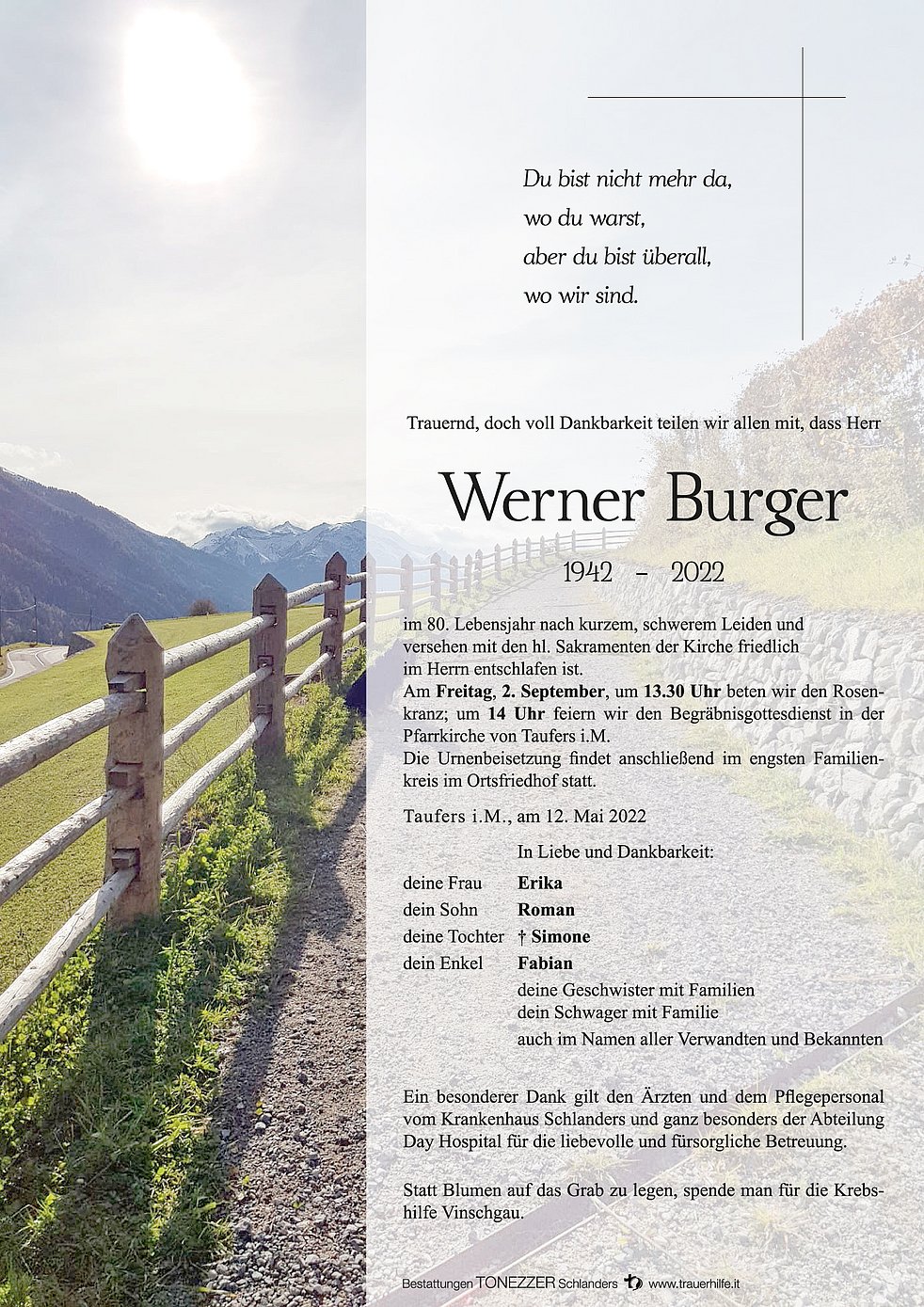 Statt Blumen auf das Grab zu legen, spende man für die Krebshilfe Vinschgau.