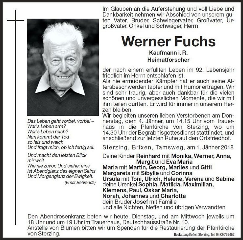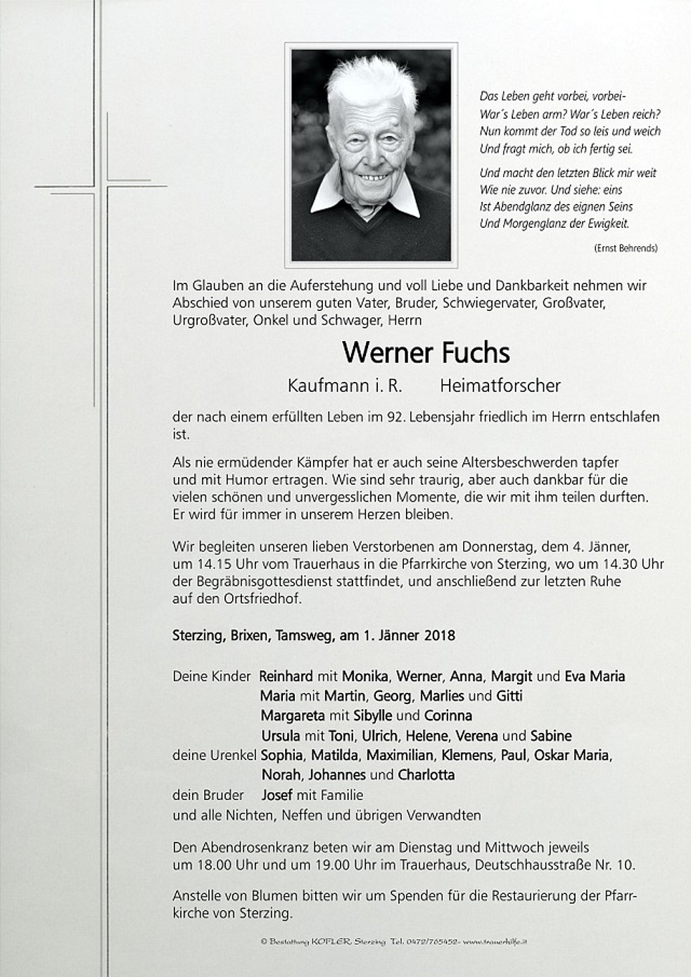 Wir begleiten unseren lieben Verstorbenen am Donnerstag, dem 4. Jänner, um 14.15 Uhr vom Trauerhaus in die Pfarrkirche von Sterzing, wo um 14.30 Uhr der Begräbnisgottesdienst stattfindet, und anschließend zur letzten Ruhe auf den Ortsfriedhof.