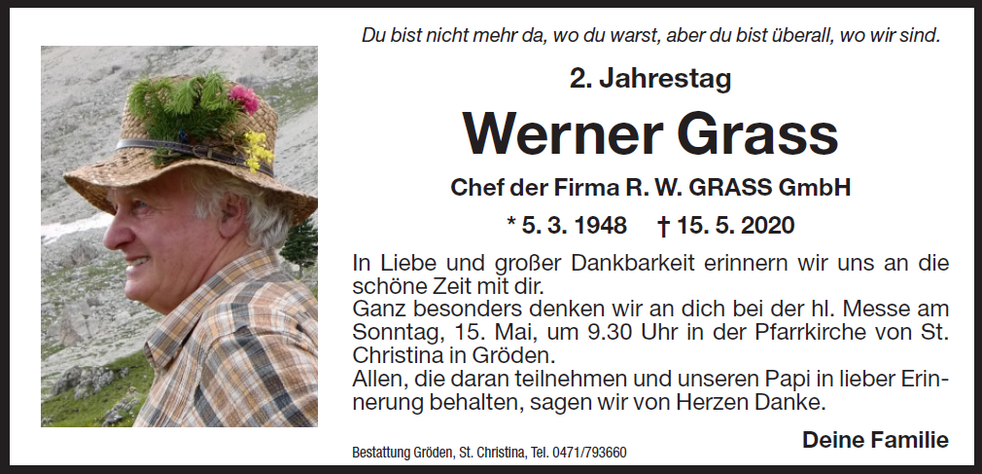 Der Trauergottesdienst findet am Donnerstag, dem 21. Mai, um 14.30 Uhr in der Pfarrkirche von St. Christina statt.
