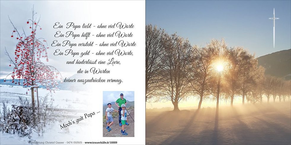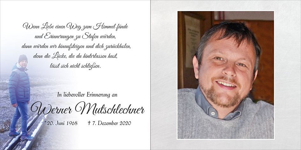 Deine schwere Krankheit hast du mit viel Geduld, ohne Klagen und mit eisernem Willen ertragen. Deine Kräfte waren am Ende und du bist nun zu den Engeln heimgekehrt. Traurig, aber dankbar für all das Schöne, das wir mit dir teilen durften, nehmen wir schweren Herzens Abschied von meinem geliebten Mann, unserem herzensguten Papa, meinem lieben Sohn, Bruder, Schwiegersohn, unserem Schwager und Onkel, Herrn