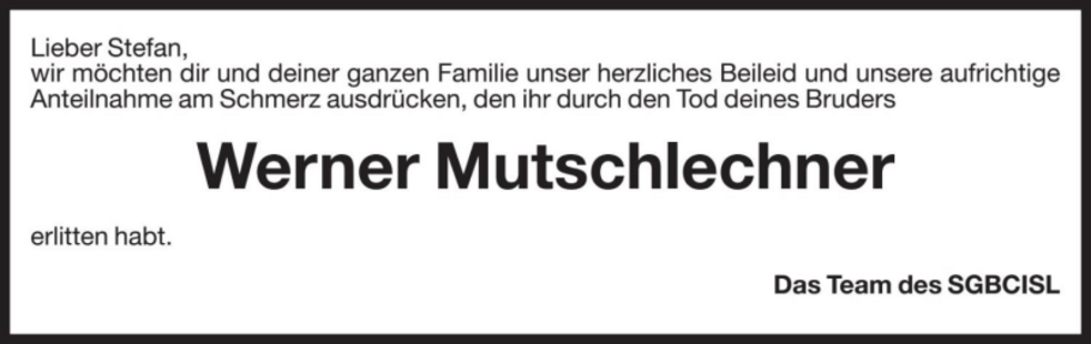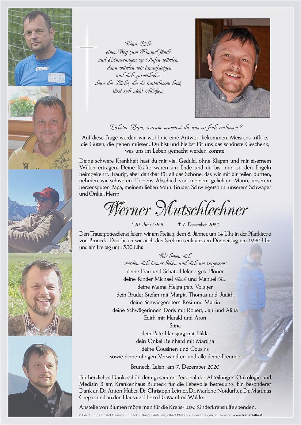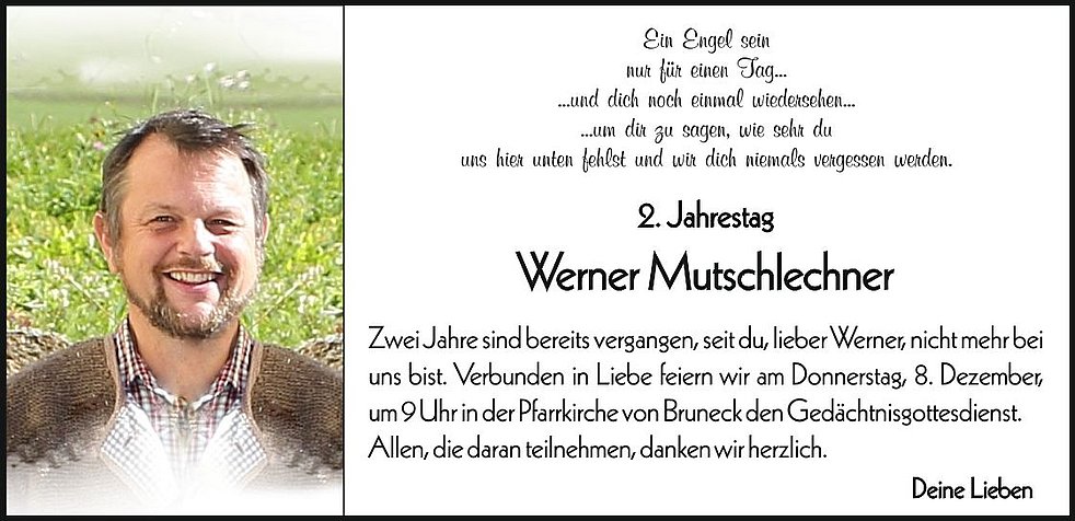Den Trauergottesdienst feiern wir am Freitag, dem 8. Jänner, um 14 Uhr in der Pfarrkirche von Bruneck. Dort beten wir auch den Seelenrosenkranz am Donnerstag um 19.30 Uhr und am Freitag um 13.30 Uhr.
