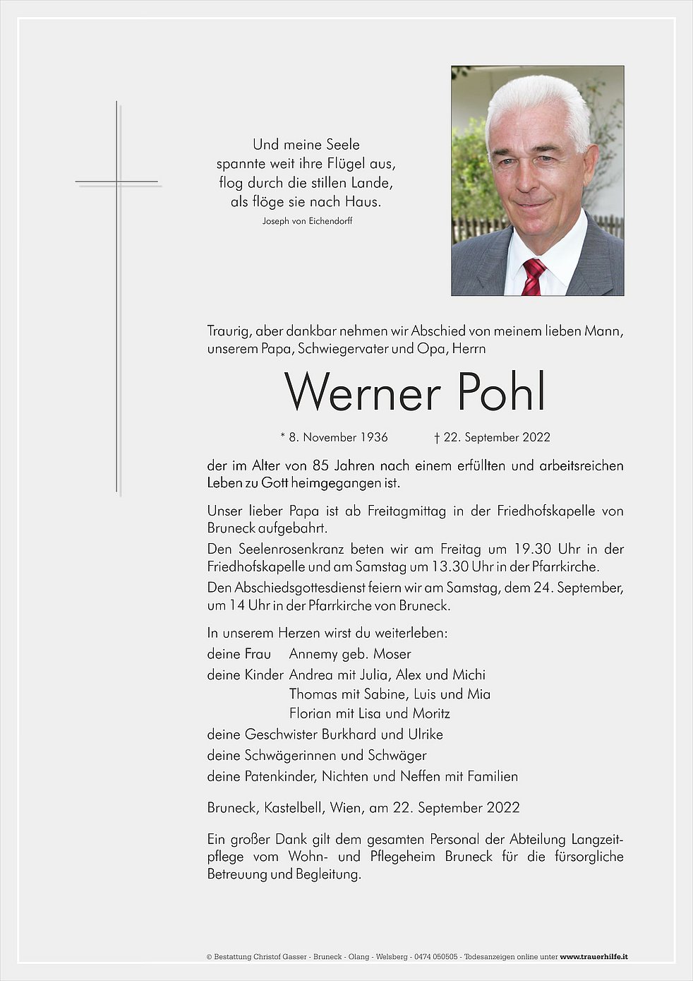 Werner erblickte 1936 in Kastelbell im Vinschgau das Licht der Welt und wuchs dort mit seinen vier Geschwistern auf. Nach der Volksschule besuchte er die Gewerbeschule in Bozen.