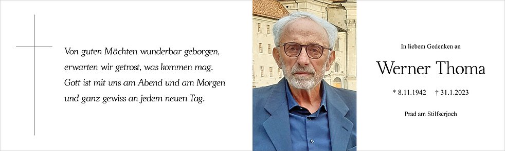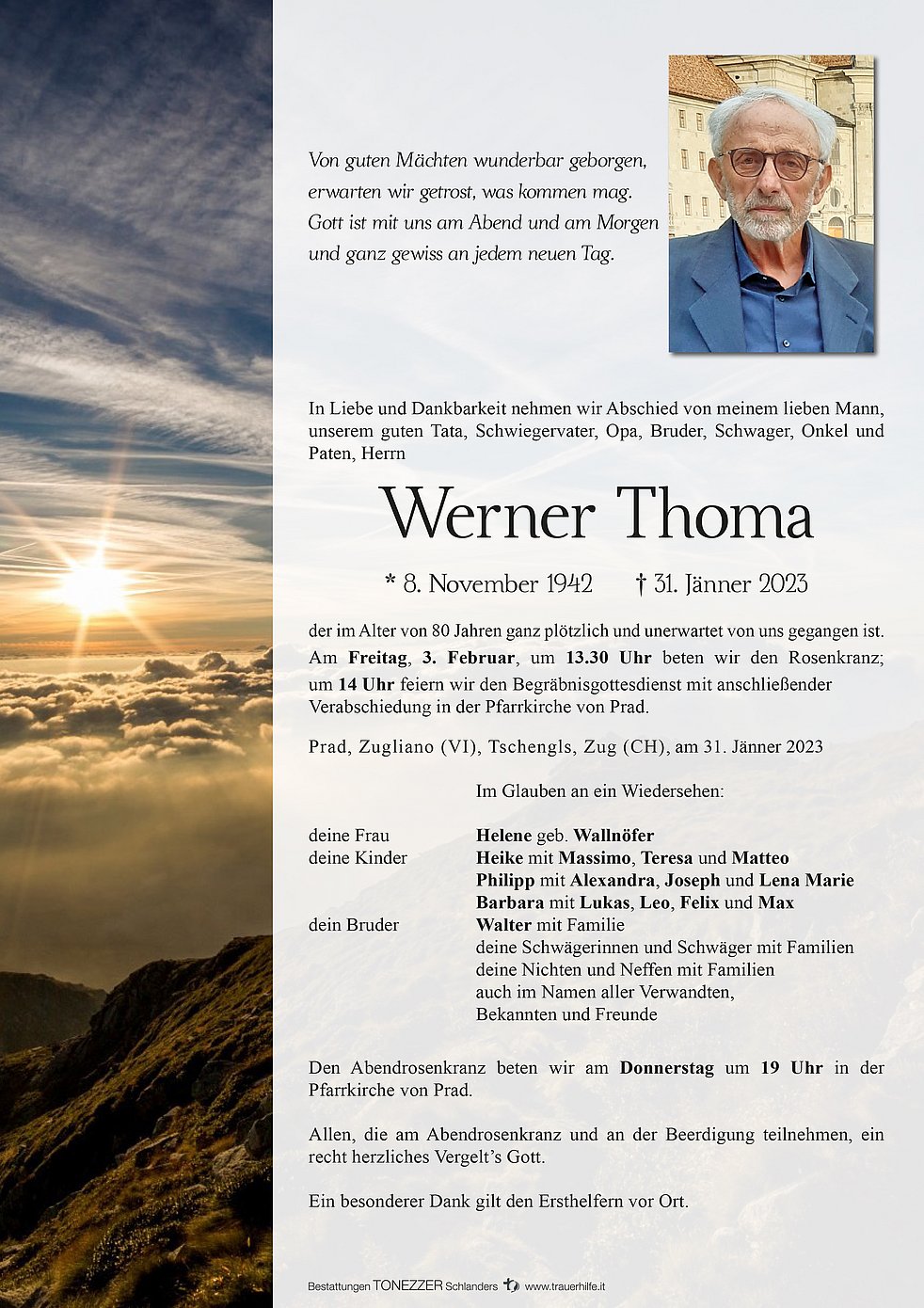 Am Freitag, 3. Februar, um 13.30 Uhr beten wir den Rosenkranz; um 14 Uhr feiern wir den Begräbnisgottesdienst mit anschließender Verabschiedung in der Pfarrkirche von Prad.