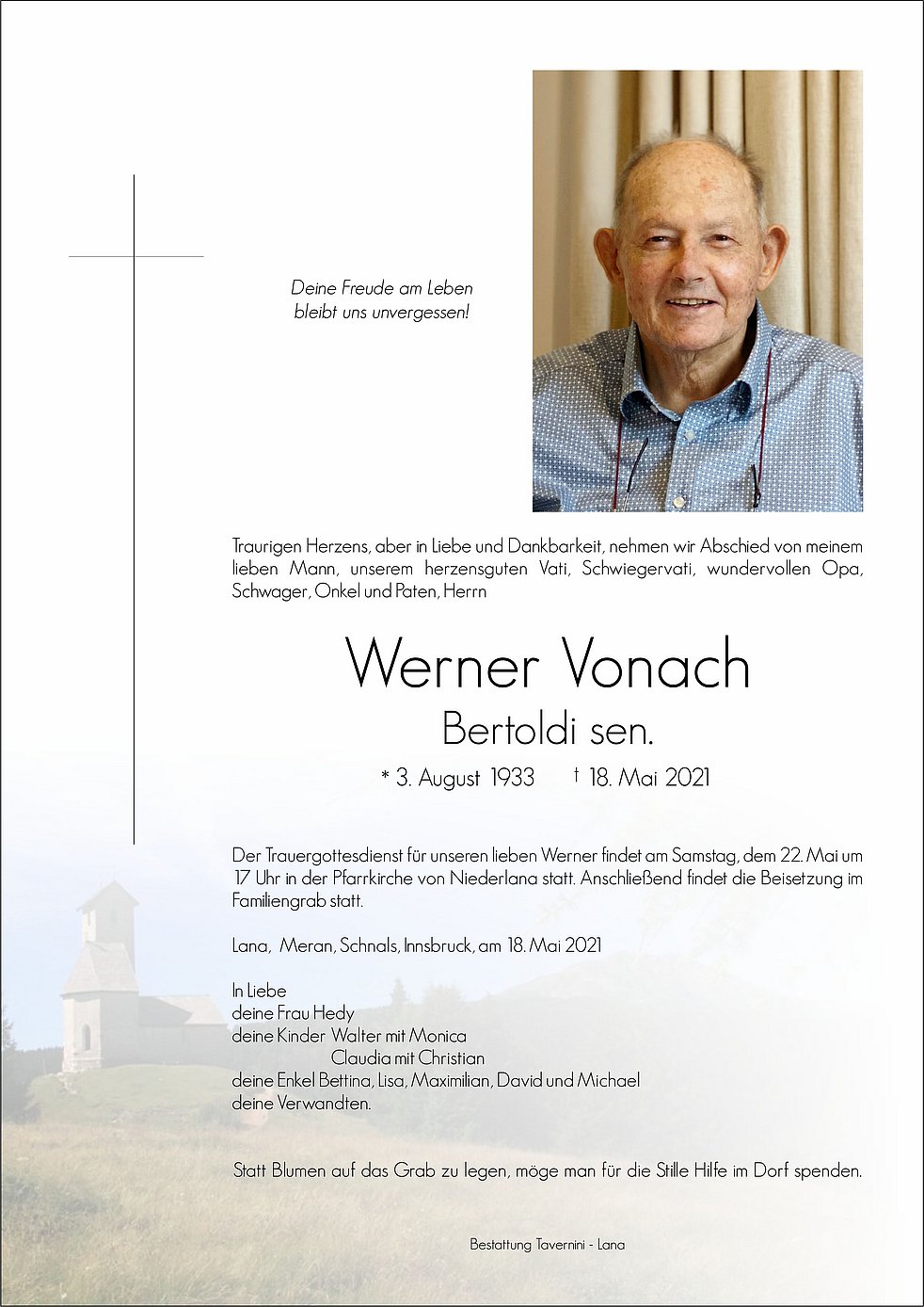 Lieber Werner, Du warst am Vigiljoch mein Nachbar, Du warst mit mir im Schiurlaub und wir haben gemeinsam das Abenteuer Heliskiing in Kanada erlebt. Ich Danke Dir für die vielen tollen Stunden, die ich mit Dir verbringen durfte, besonders beim Schifahren. Ruhe nun in Frieden und lass Dein Leben Revue passieren, es war interessant, voll Erlebnisse und sehr erfolgreich. Ich werde Dich als einen besonderen Menschen in Erinnerung behalten, Elmar