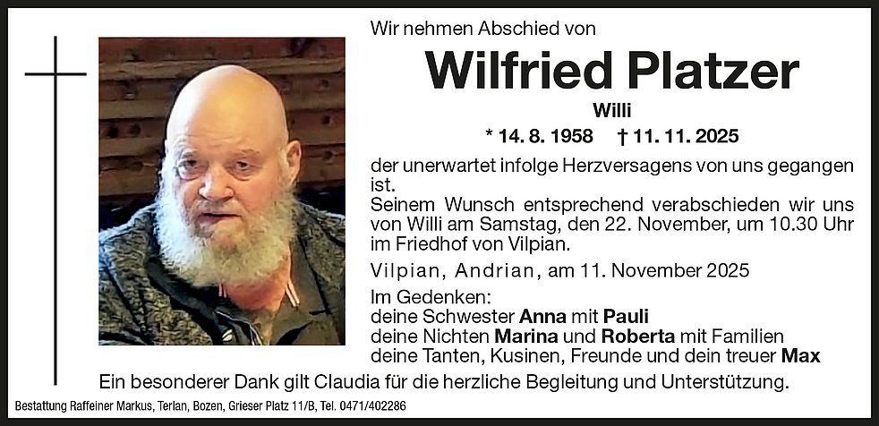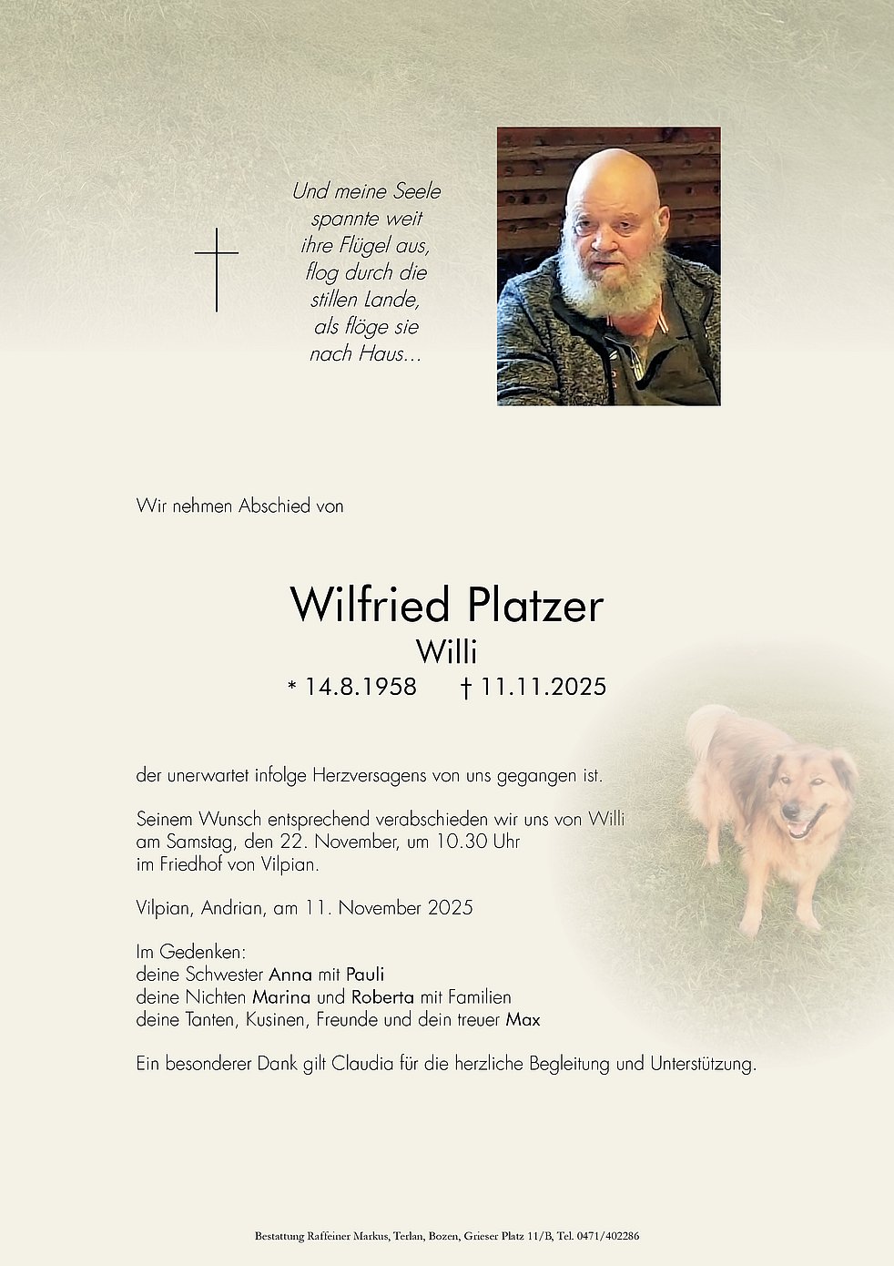 Seinem Wunsch entsprechend verabschieden wir uns von Willi am Samstag, den 22. November, um 10.30 Uhr im Friedhof von Vilpian.