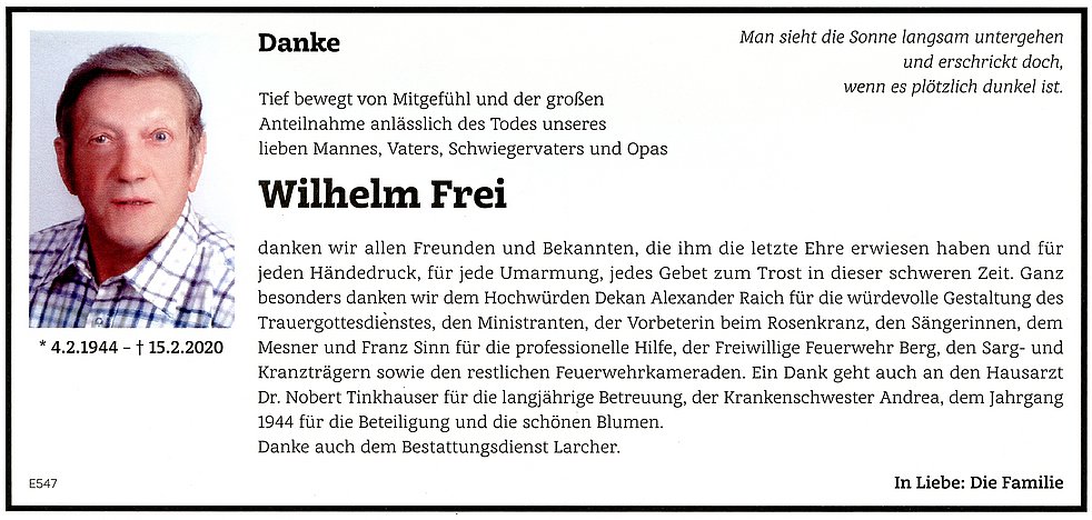 Allen, die am Rosenkranz und an der Beerdigung teilnehmen im Voraus, ein herzliches Vergelt’s Gott.