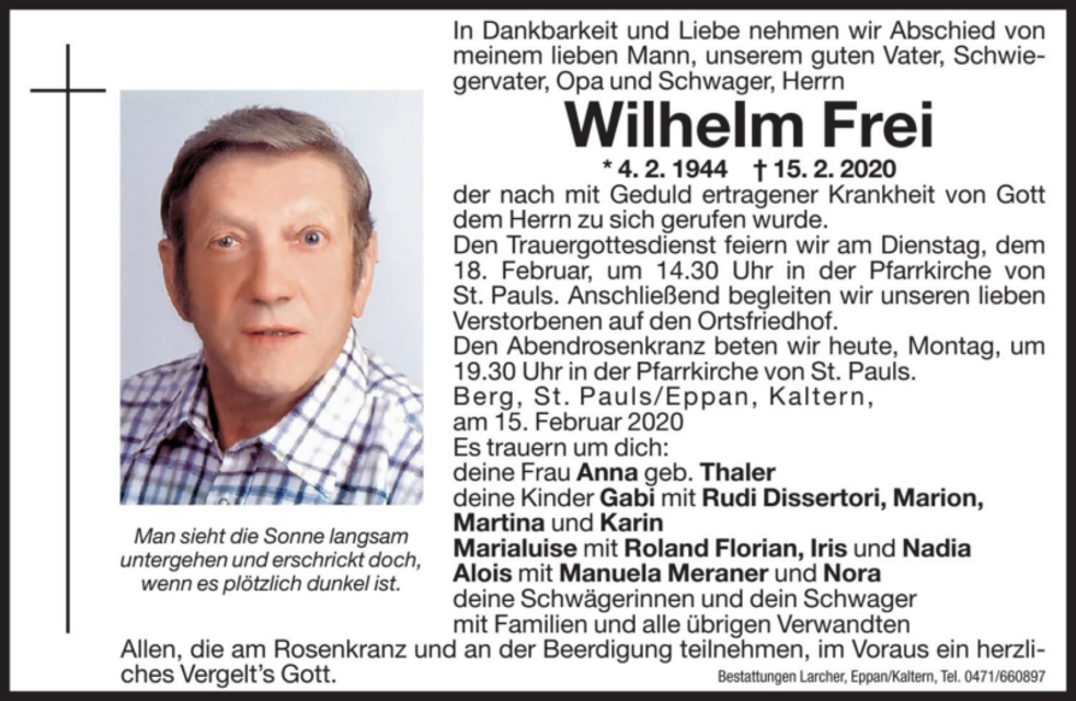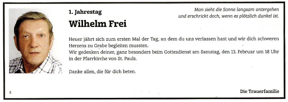 Den Trauergottesdienst feiern wir am Dienstag, dem 18. Februar um 14.30 Uhr in der Pfarrkirche von St. Pauls. Anschließend begleiten wir unseren lieben Verstorbenen auf den Ortsfriedhof.