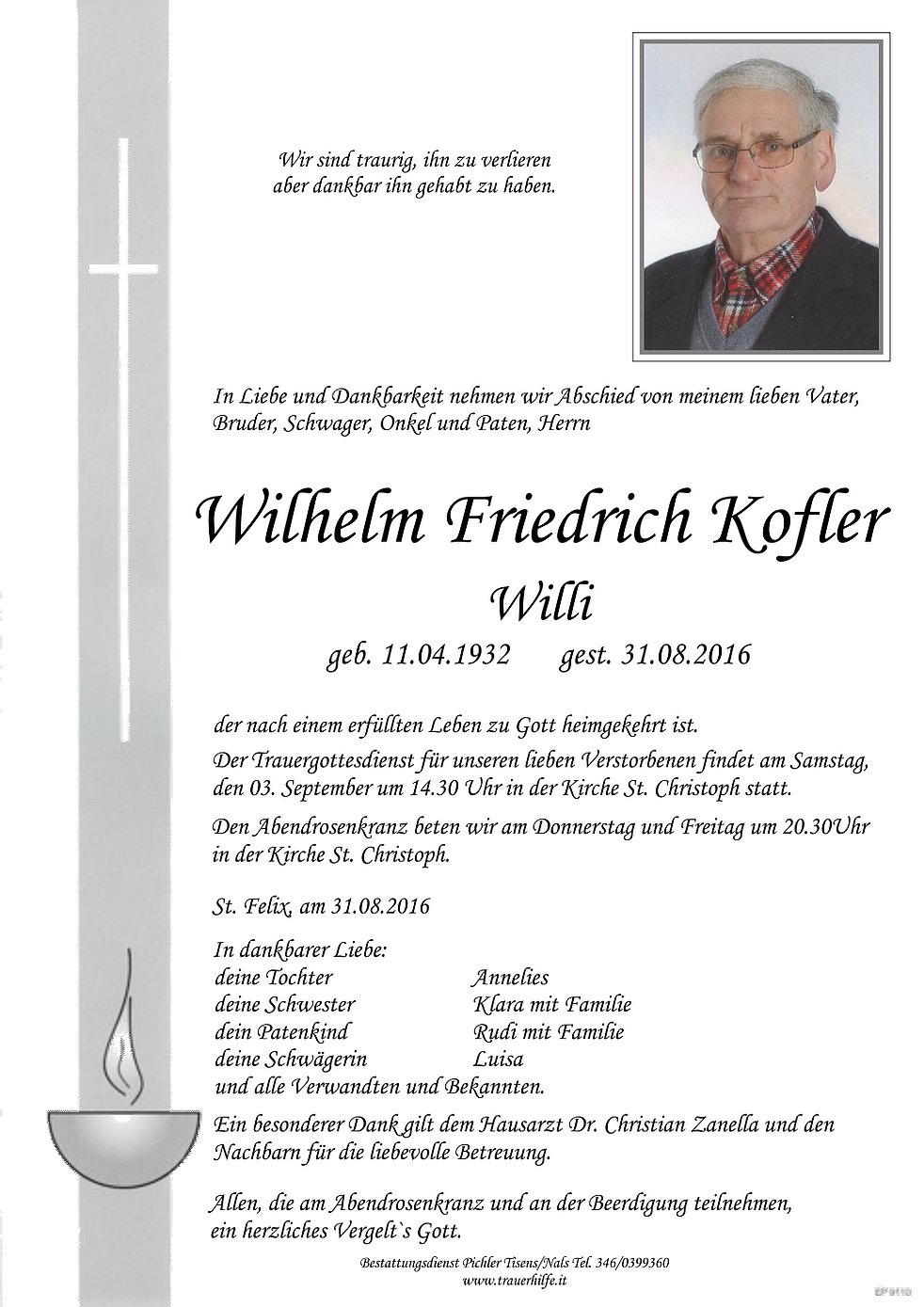 Der Trauergottesdienst für unseren lieben Verstorbenen findet am Samstag,
