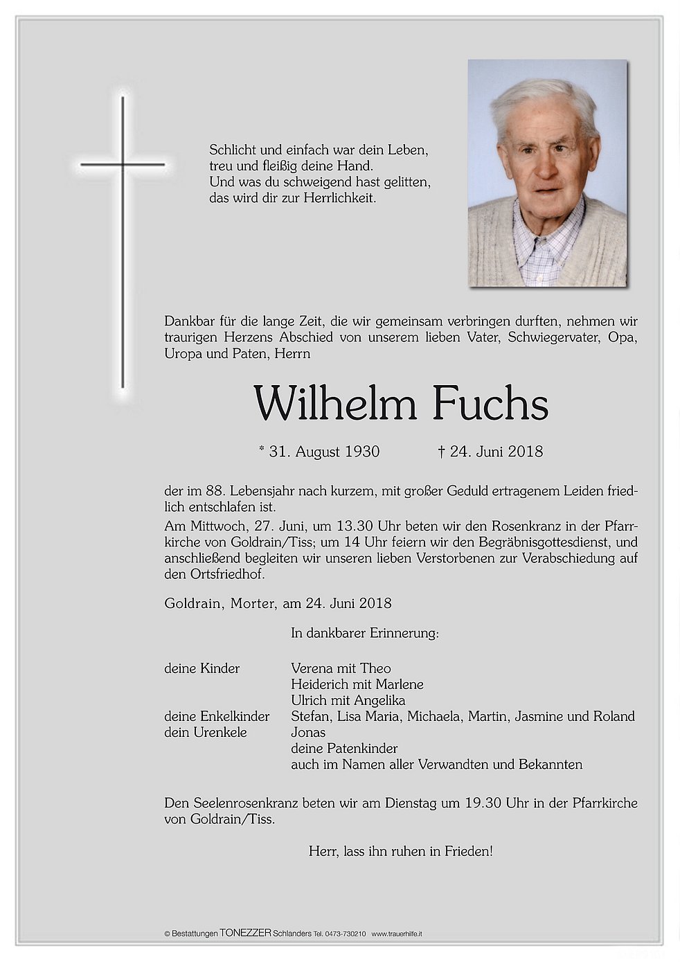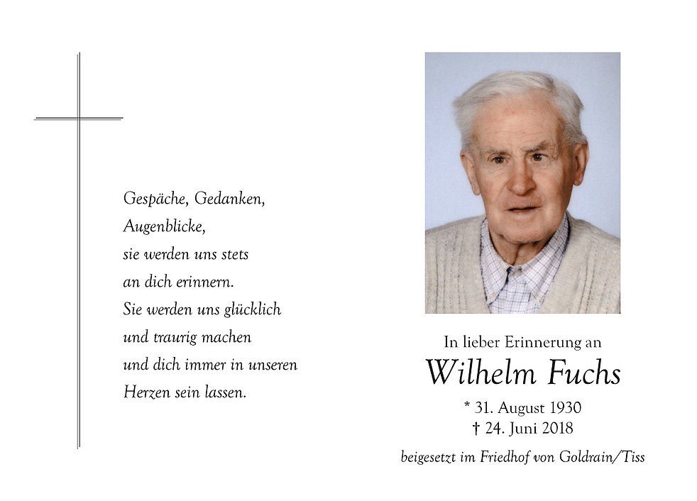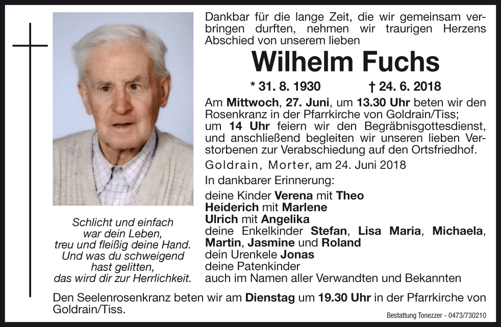 Am Mittwoch, 27. Juni, um 13.30 Uhr beten wir den Rosenkranz in der Pfarrkirche von Goldrain/Tiss; um 14 Uhr feiern wir den Begräbnisgottesdienst, und anschließend begleiten wir unseren lieben Verstorbenen zur Verabschiedung auf den Ortsfriedhof.