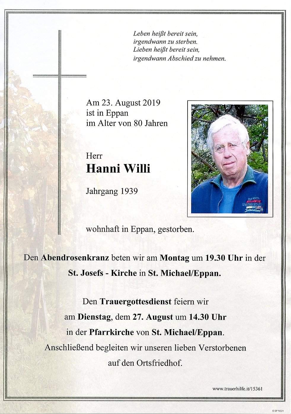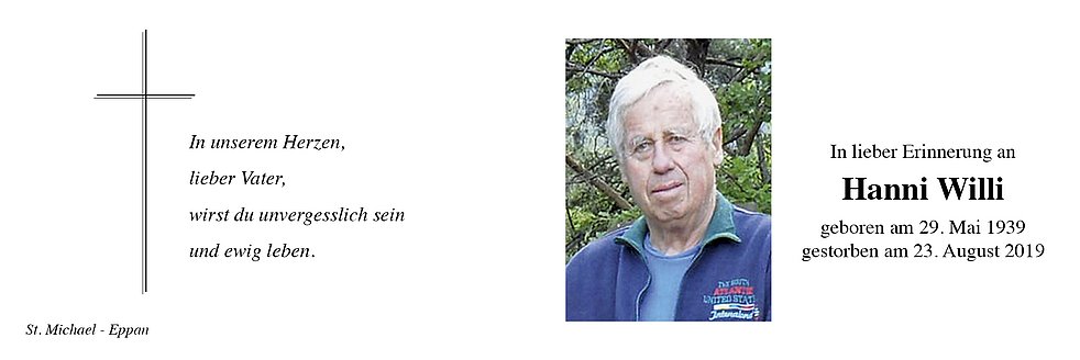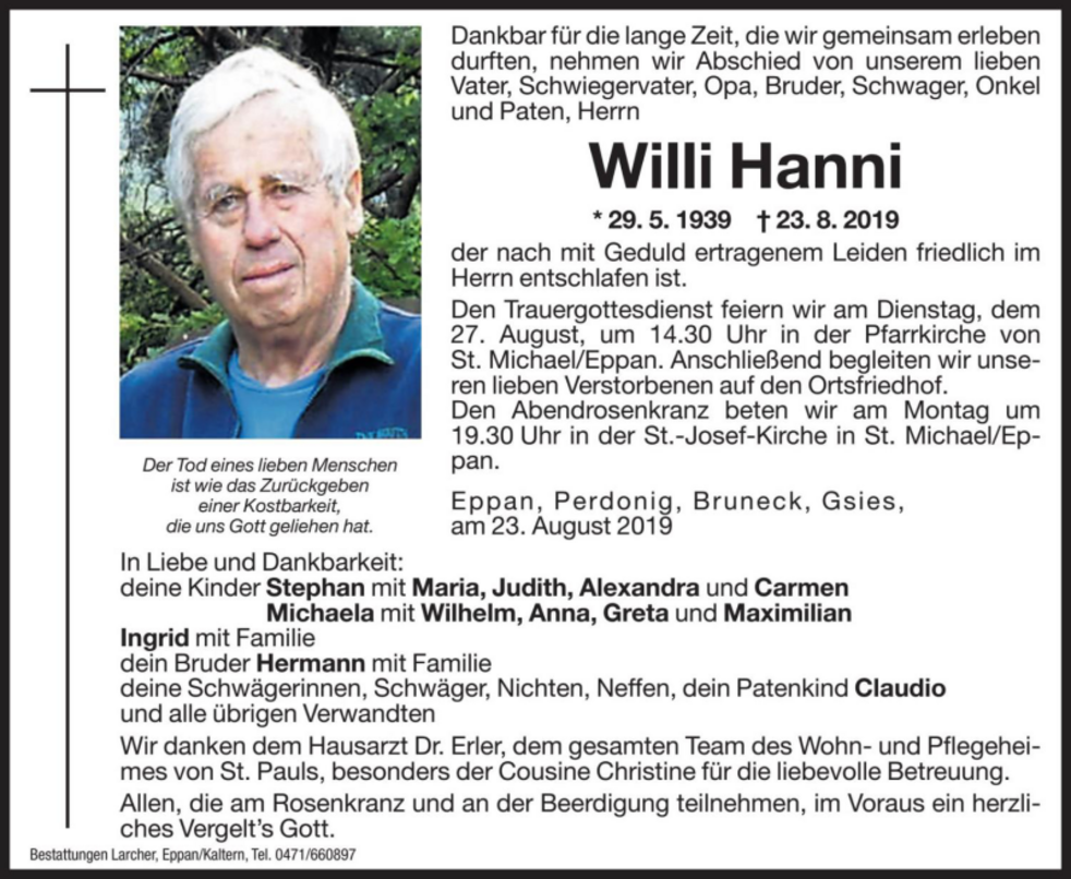 Den Trauergottesdienst feiern wir am Dienstag, dem 27. August um 14.30 Uhr in der Pfarrkirche von St. Michael/Eppan. Anschließend begleiten wir unseren lieben Verstorbenen auf den Ortsfriedhof.