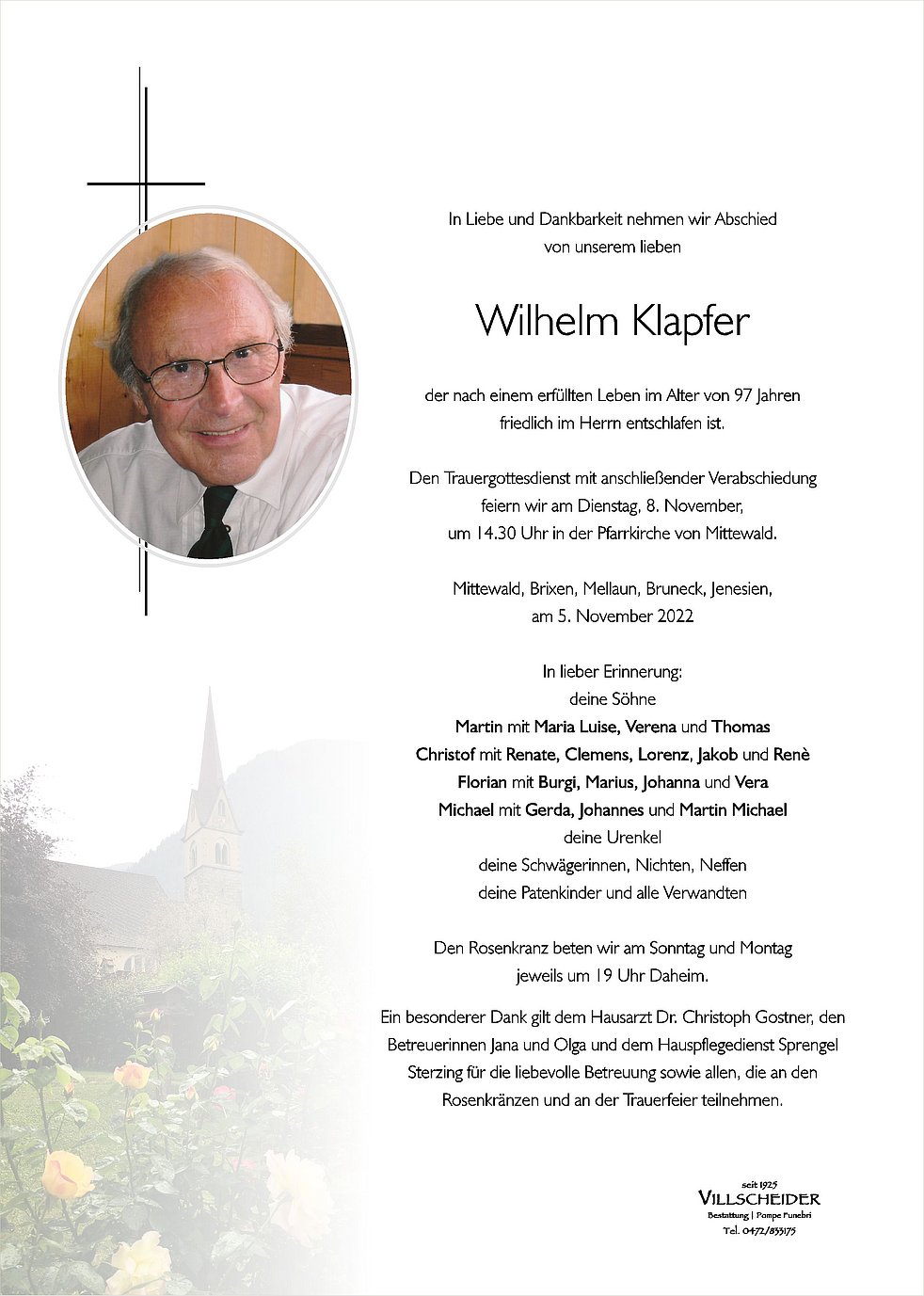 Aufrichtiges Mitgefuehl am Tode Eures Vaters Willy, moechten wir Euch liebe Klapfer-Brueder mit Familien aussprechen.