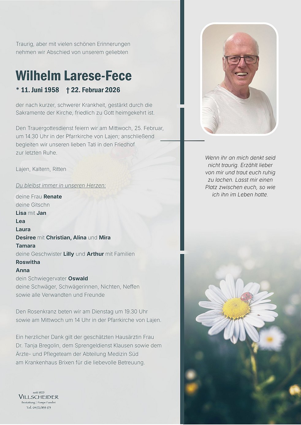 mit großer Betroffenheit haben wir vom Tod deines Vaters erfahren. Es tut uns sehr leid, dass du ihn nach kurzer, schwerer Krankheit verlieren musstest. Für diesen Verlust gibt es kaum Worte wir möchten dir unser tiefes Mitgefühl aussprechen.