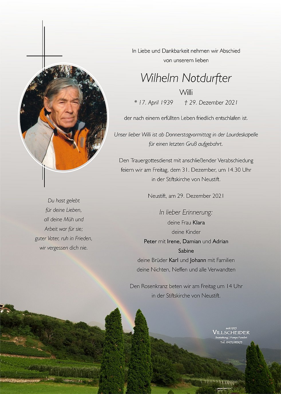 Trauerfeier: 31.12. - 14:30 Uhr Neustift