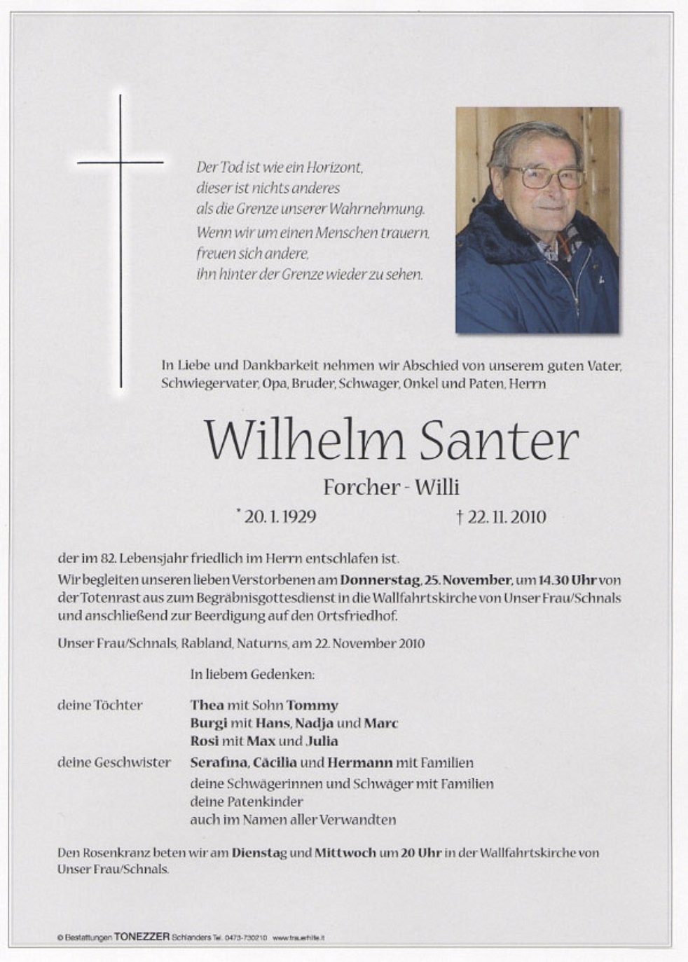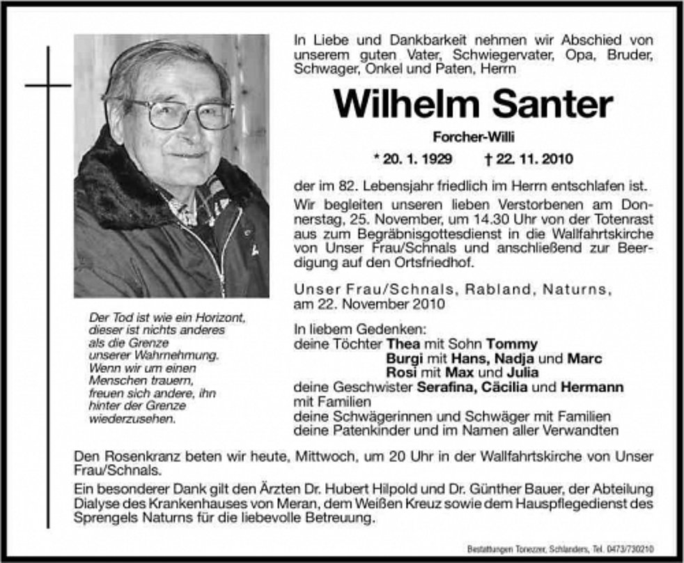 Jeden Tog hosch a Lächeln für uan iber kopp. Jeden Tog hosch a Hetz mit uan gmocht. Wenn i sou nochdenk konn i gor nit glaben dass mir ins auf der Welt nimmer segn werden. Liaber Willi, danke für die schianen Stunden dei i mit dir verbringen gekennt honn. Danke für die netten Ratscherlen dei mir so in und auswerts gmocht hoben.