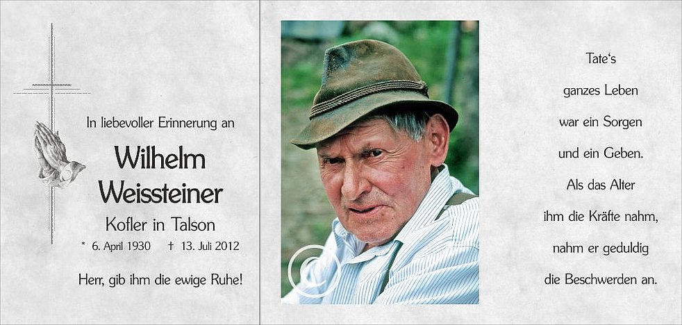 Wir begleiten unseren lieben Tate am Montag, dem 16. Juli, um 12.30 Uhr vom Heimathaus ausgehend, zum Abschiedsgottesdienst um 14.30 Uhr in die Pfarrkirche von Terenten. Anschließend übergeben wir ihn der geweihten Erde.