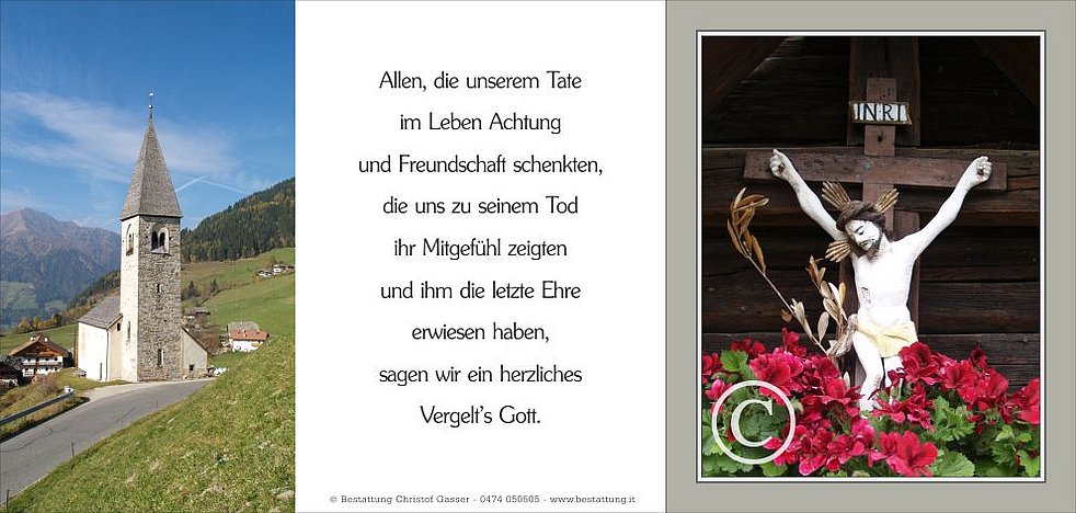 Ein Dank gilt der Hausärztin Dr. Claudia Reier sowie den Ärzten und dem gesamten Pflegepersonal der Abteilung Medizin A am Krankenhaus Bruneck und den Sprengelschwestern für die liebevolle Betreuung und Begleitung.