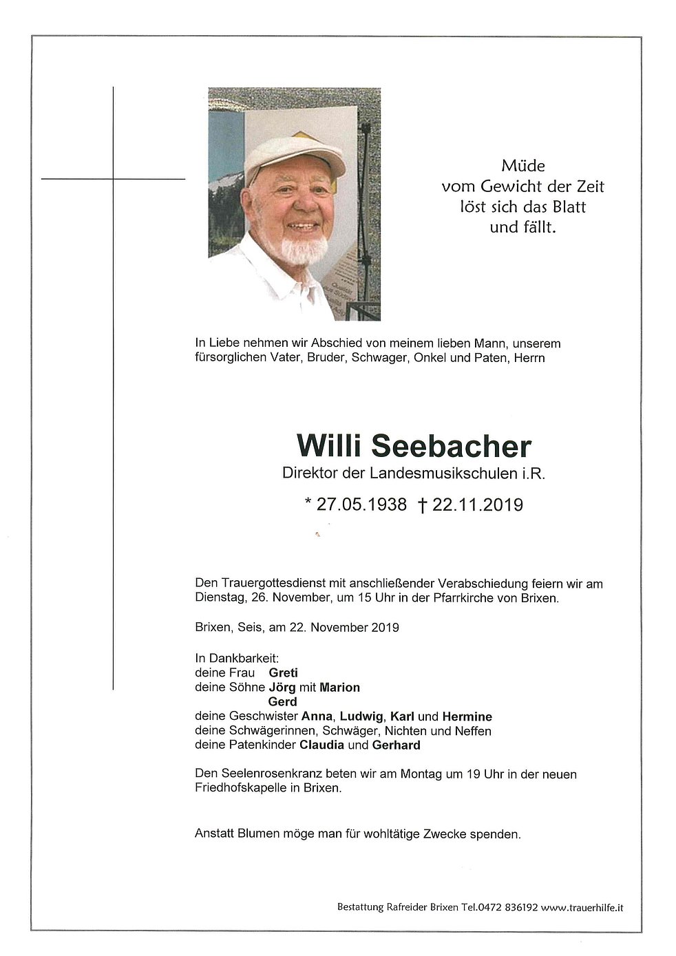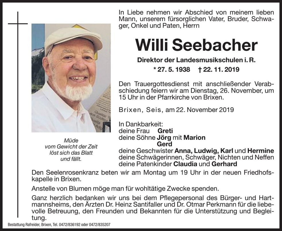Den Trauergottesdienst mit anschließender Verabschiedung feiern wir am Dienstag, 26. November, um 15 Uhr in der Pfarrkirche von Brixen.