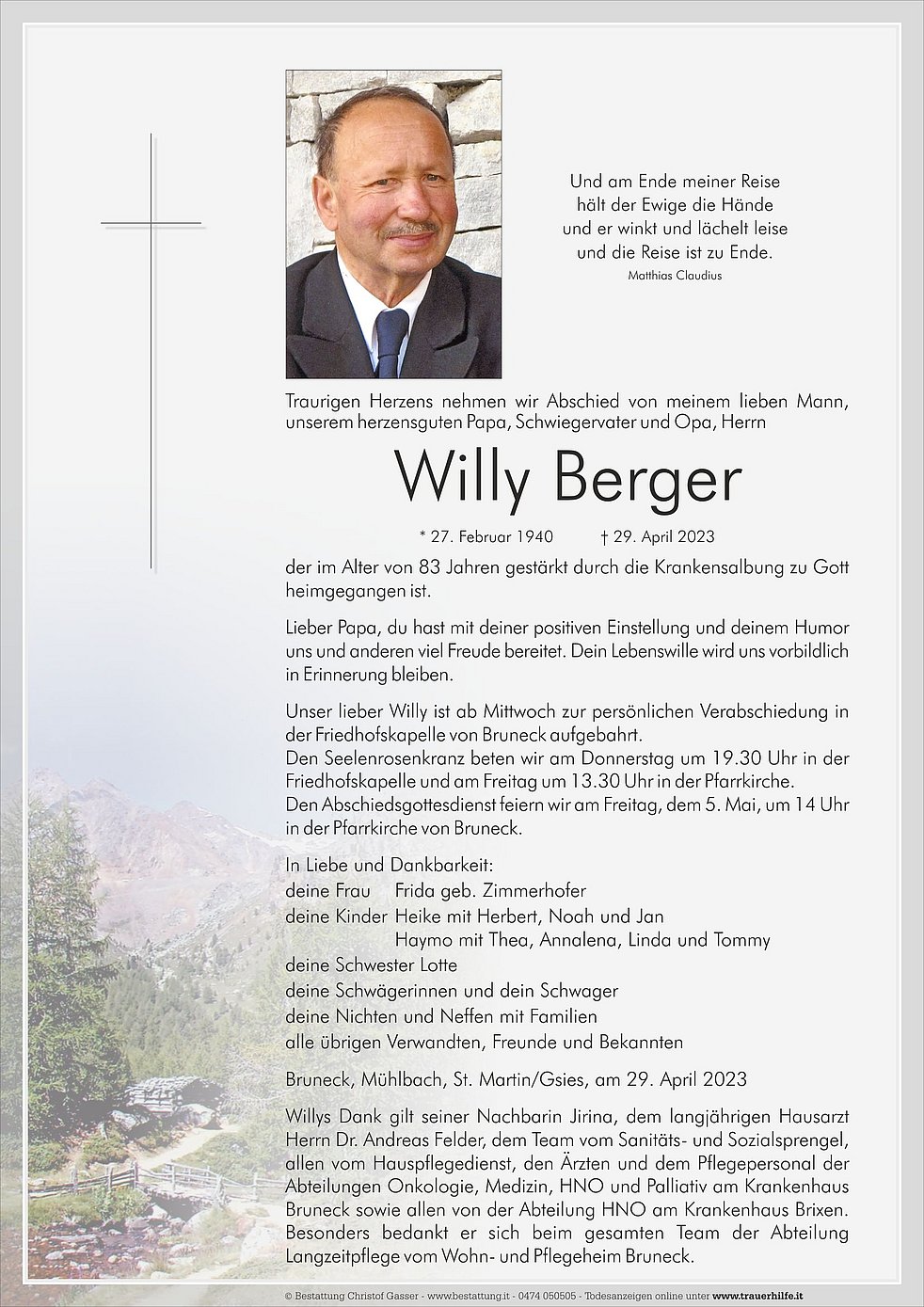 Willys Dank gilt seiner Nachbarin Jirina, dem langjährigen Hausarzt Herrn Dr. Andreas Felder, dem Team vom Sanitäts- und Sozialsprengel, allen vom Hauspflegedienst, den Ärzten und dem Pflegepersonal der Abteilungen Onkologie, Medizin, HNO und Palliativ am Krankenhaus Bruneck sowie allen von der Abteilung HNO am Krankenhaus Brixen. Besonders bedankt er sich beim gesamten Team der Abteilung Langzeitpflege vom Wohn- und Pflegeheim Bruneck.