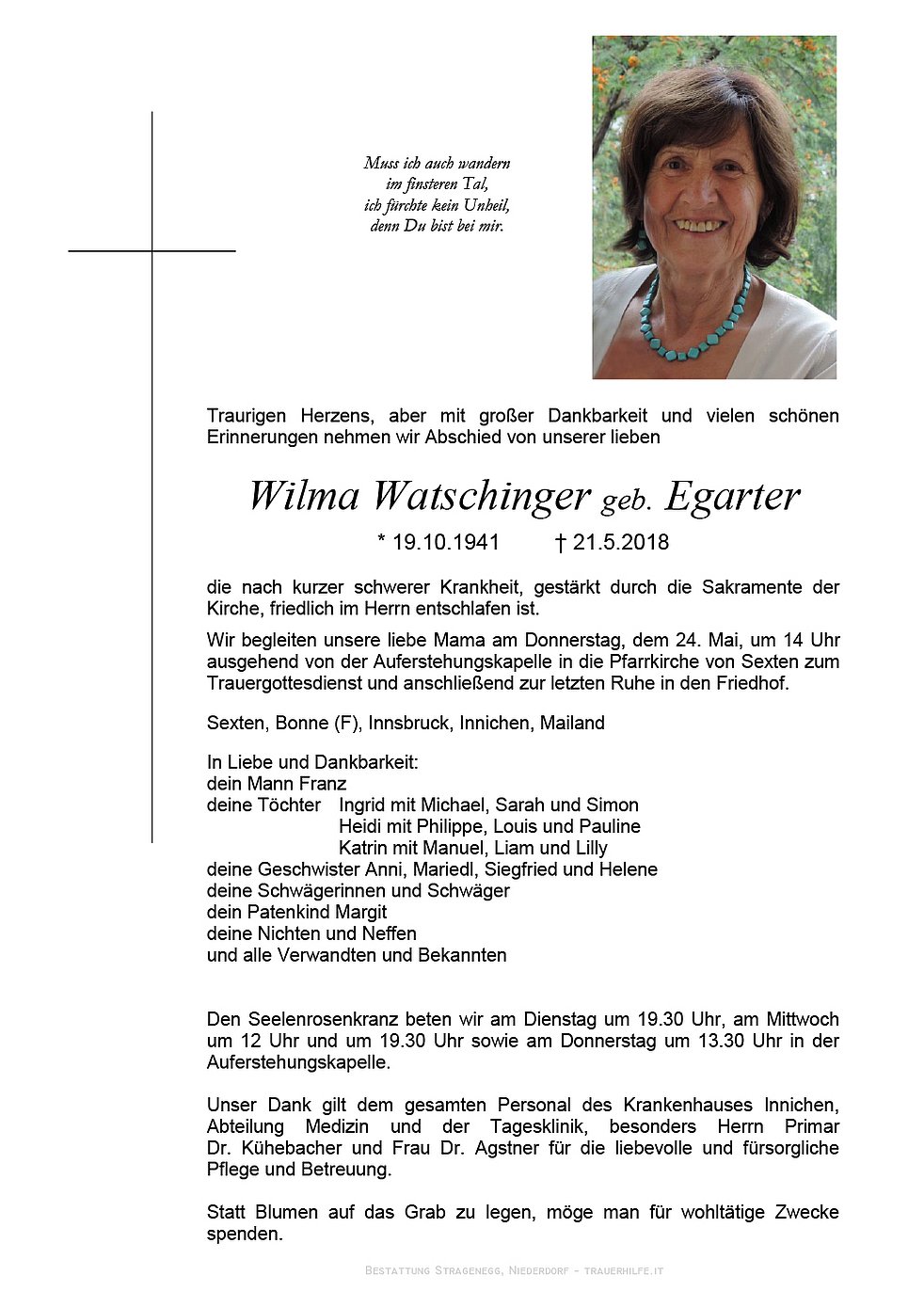 Wir begleiten unsere liebe Mama am Donnerstag, dem 24. Mai, um 14 Uhr ausgehend von der Auferstehungskapelle in die Pfarrkirche von Sexten zum Trauergottesdienst und anschließend zur letzten Ruhe in den Friedhof.