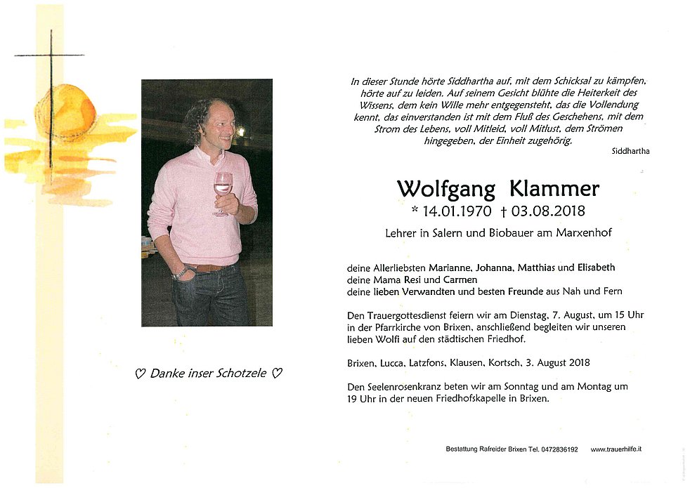 Den Trauergottesdienst feiern wir am Dienstag, 7. August, um 15 Uhr in der Pfarrkirche von Brixen, anschließend begleiten wir unseren lieben Wolfi auf den städtischen Friedhof.